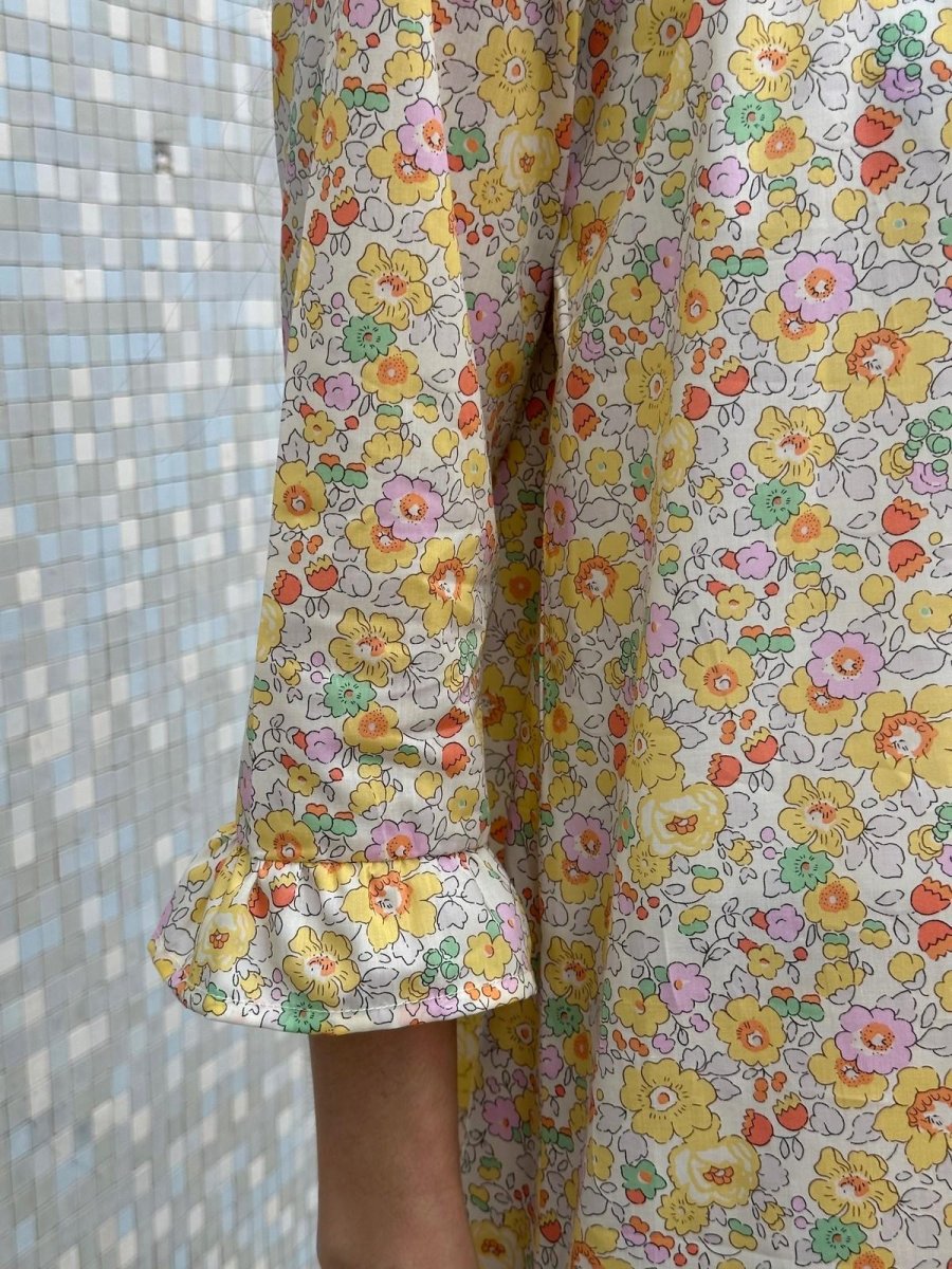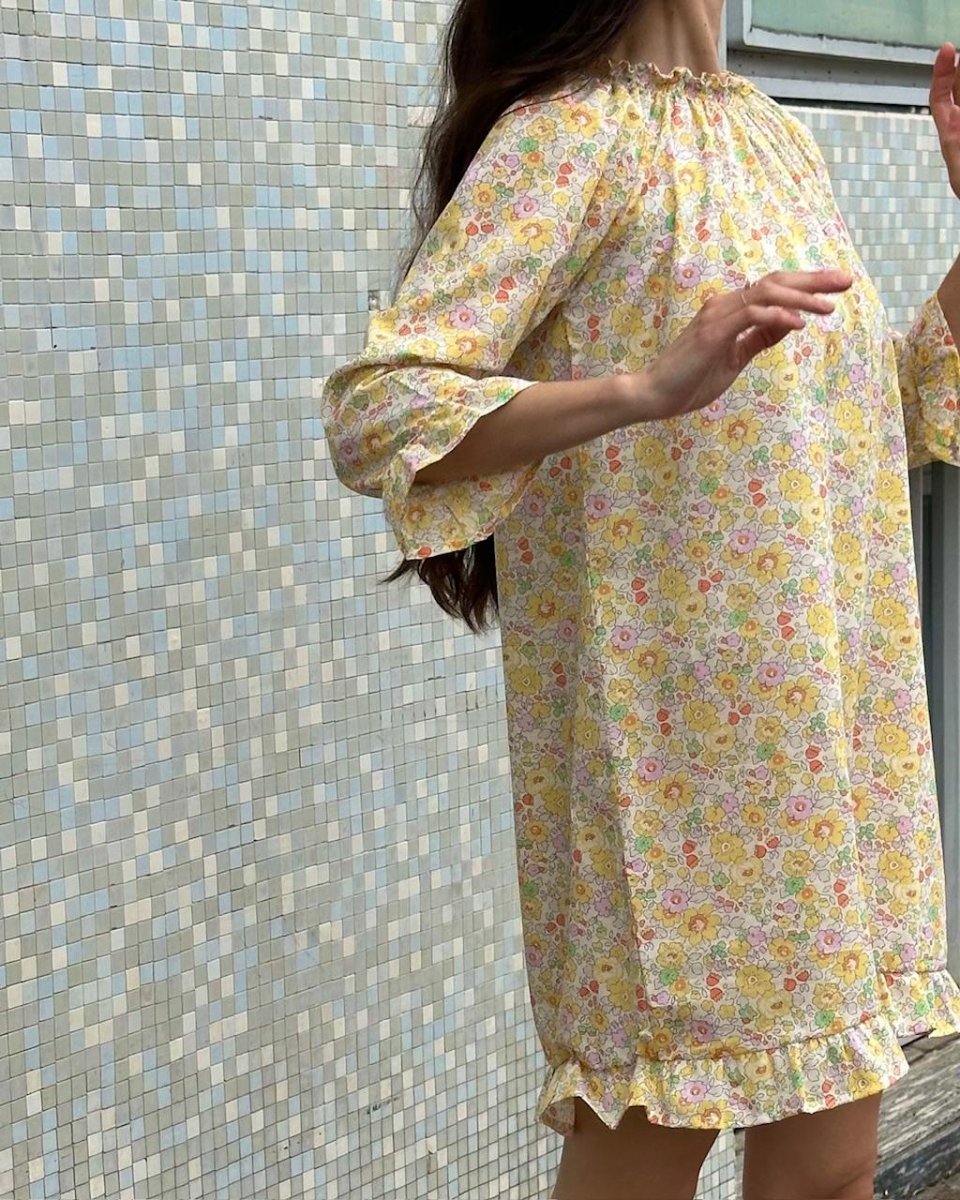 Abitino in tessuto Liberty London, disegno “Betsy”. Manica raglan, collo con arricciatura, volant sul fondo e alle maniche. 100% cotone. Modello corto. La taglia indossata è la L su un’altezza di 1.75.
