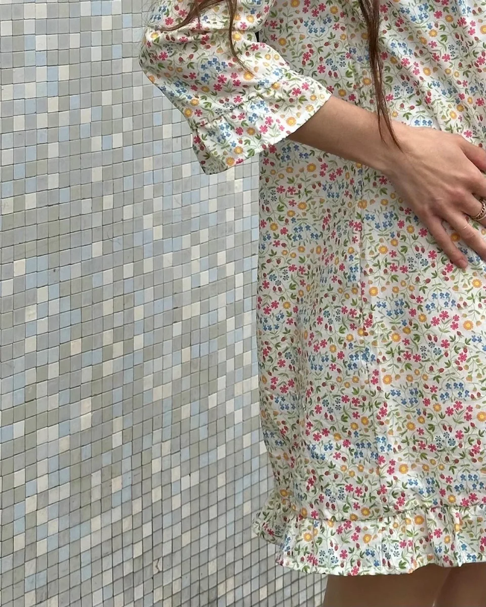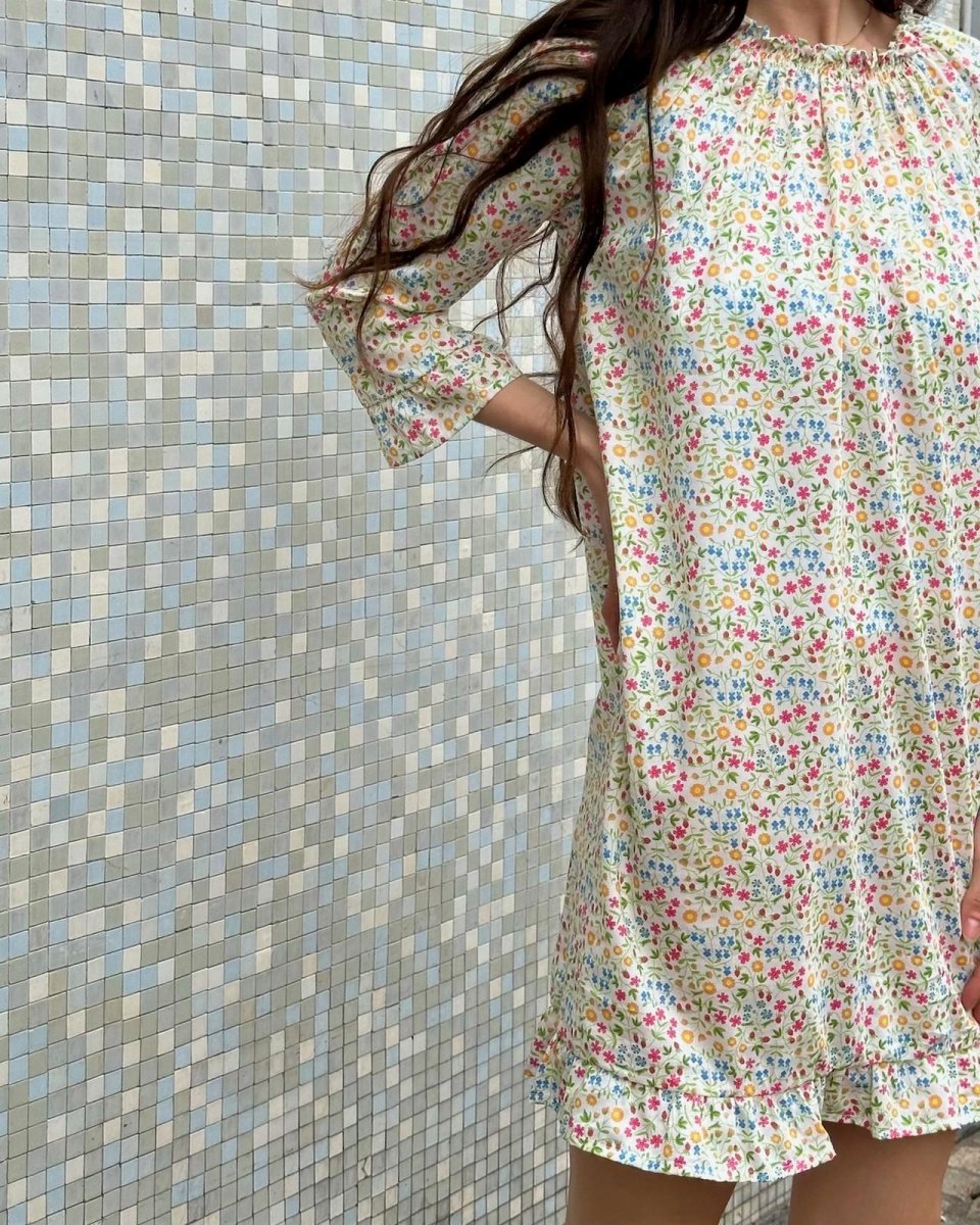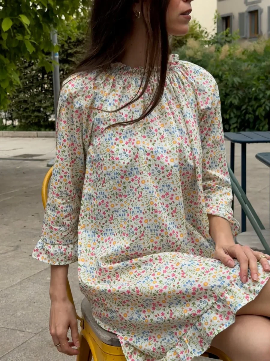 Abitino in tessuto Liberty London, disegno “Little Mirabelle”. Manica raglan, collo con arricciatura, volant sul fondo e alle maniche. 100% cotone. Modello corto. La taglia indossata è la L su un’altezza di 1.75.