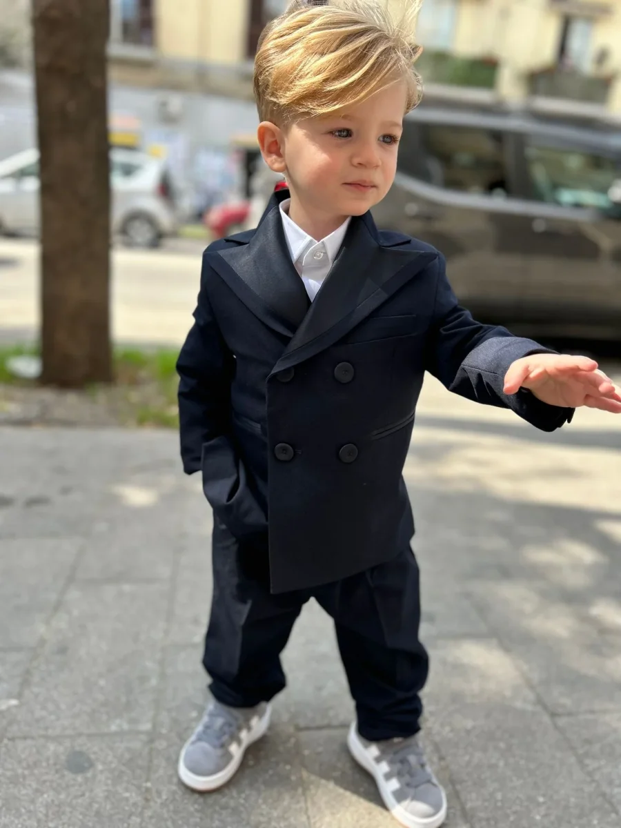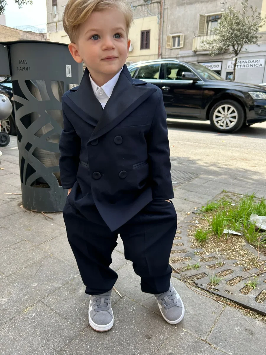 Vesti il tuo bambino con stile e comfort con l’abito alejandro. Realizzato con una giacca rever lucida e un doppio petto elegante, questo abito รจ perfetto per ogni occasione formale. La sua vestibilitร  garantisce una perfetta vestibilitร  e il suo design alla moda lo rende un must-have per i tuoi piccoli. Il bambino in foto veste 2 anni.