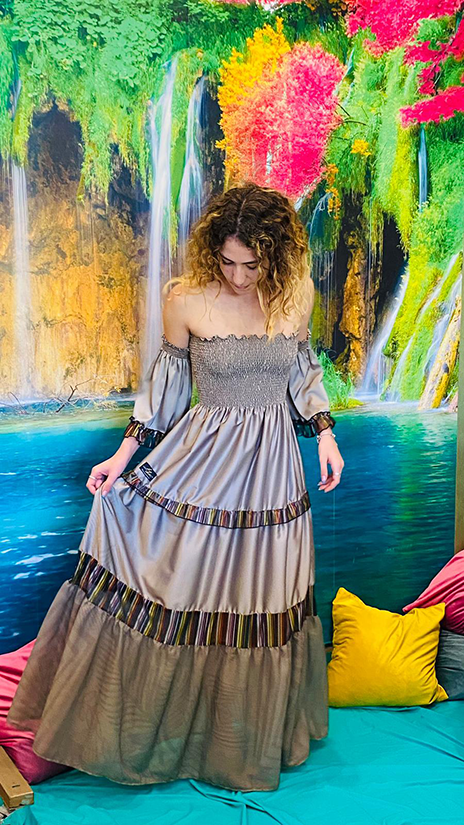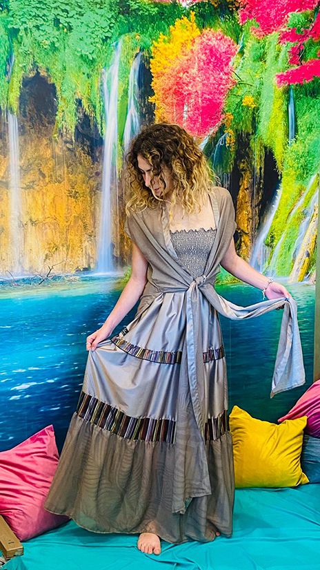 Abito Barbara nella variante fango, รจ l’abito adatto ad ogni tipologia di donna, unico ed elegante, con ampie maniche rimovibili