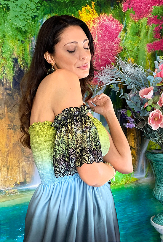 Unico e romantico, l’abito Barbara, nella variante Island, non potrร mancare nel tuo armadio. Le balze sono arricchite da un’ elegante passamaneria flockata, stampa esclusiva Ludovica L’amante. Puรฒ essere indossato da tutte le tipologie di donna grazie all’arricciatura sul corpetto. Adatto per diverse occasioni, indossabile con o senza maniche, per avere sempre un tocco di originalitร . Disponibile in diverse fantasie e tonalitร .