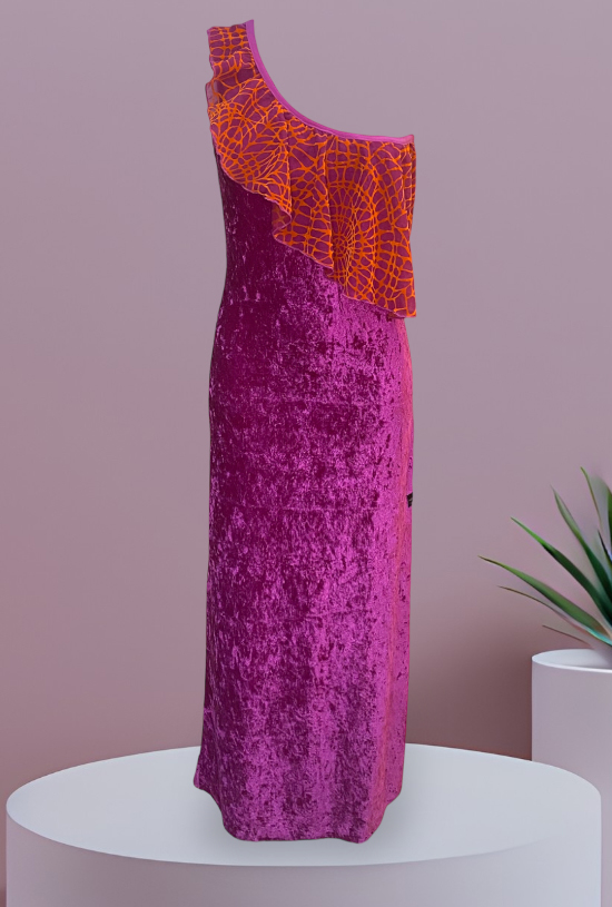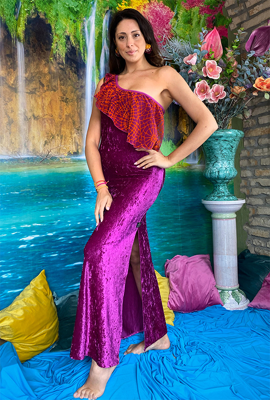 Abito Clarissa nella variante butterfly, mono spalla con balza in chiffon, profondo spacco laterale in morbida e sensuale lycra vellutata.