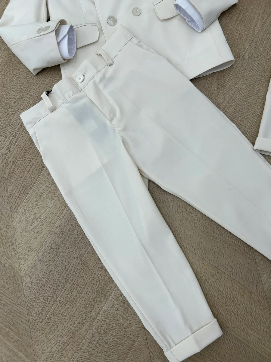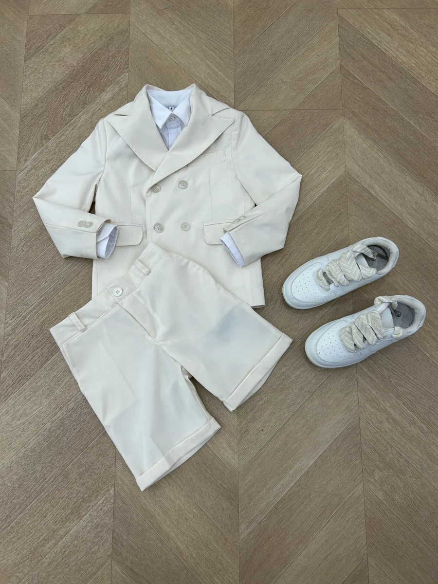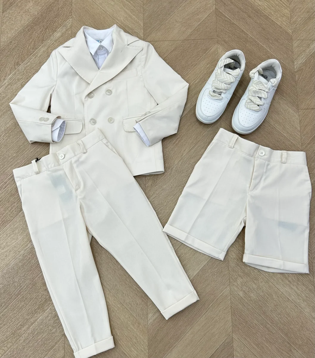 Questo abito Miami panna รจ perfetto per un look elegante e professionale. La giacca e il pantalone sono realizzati con materiali di alta qualitร per garantire comfort e stile. Aggiungi un tocco di classe al tuo guardaroba con questo abito versatile e di alta qualitร . nel prezzo non รจ compreso lo short.