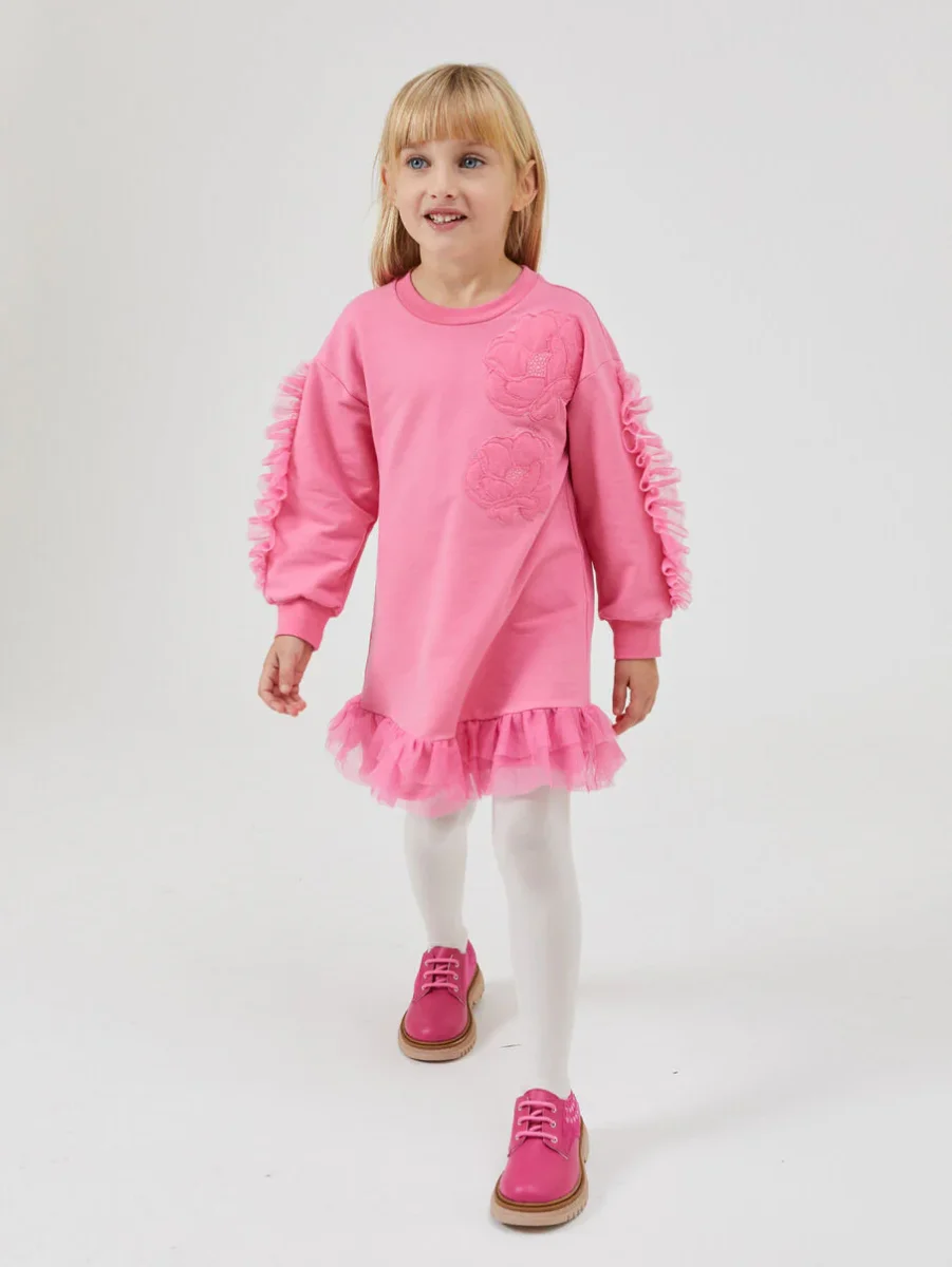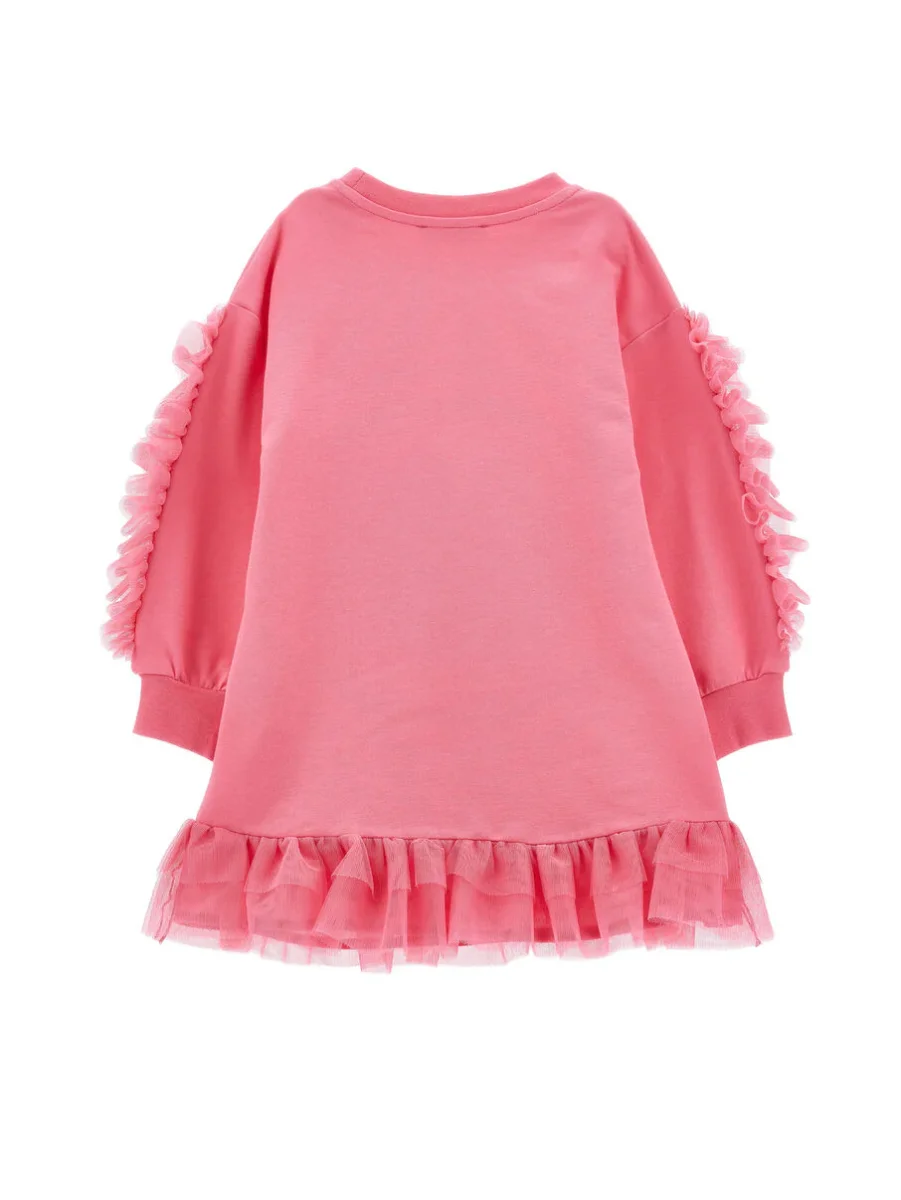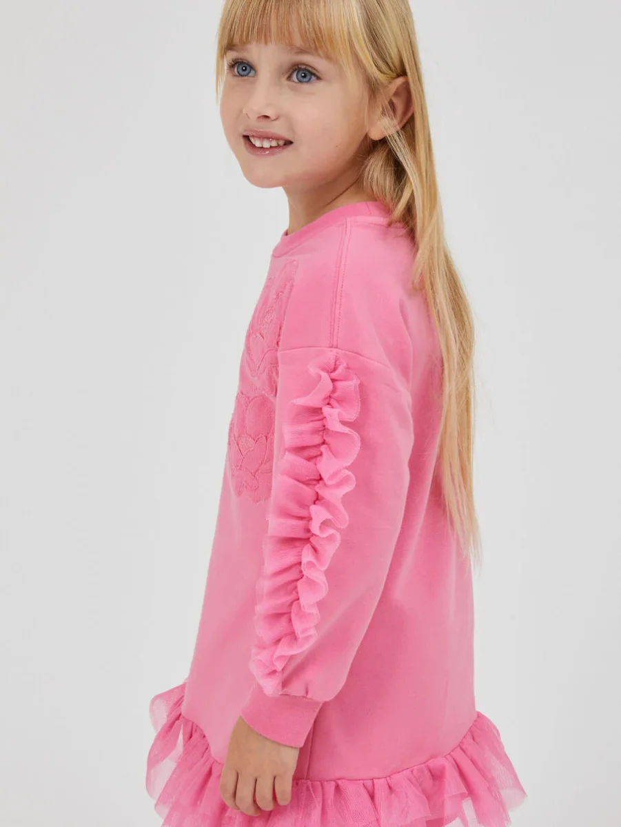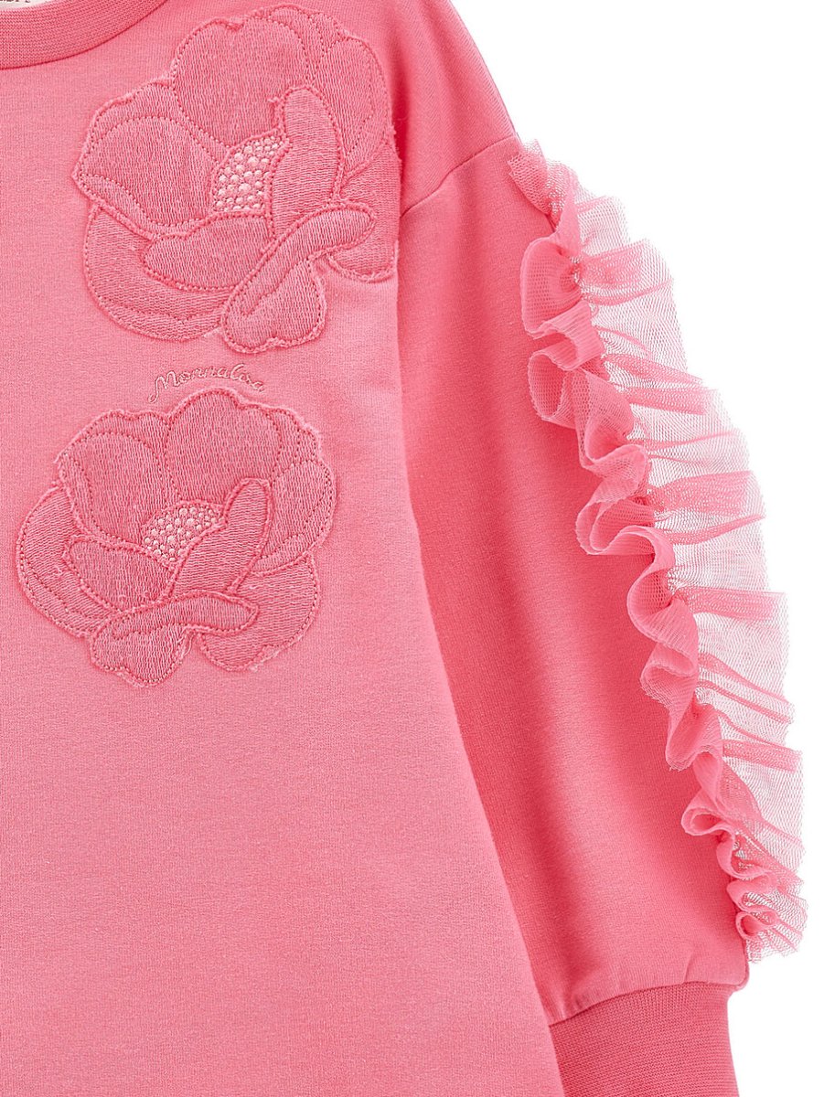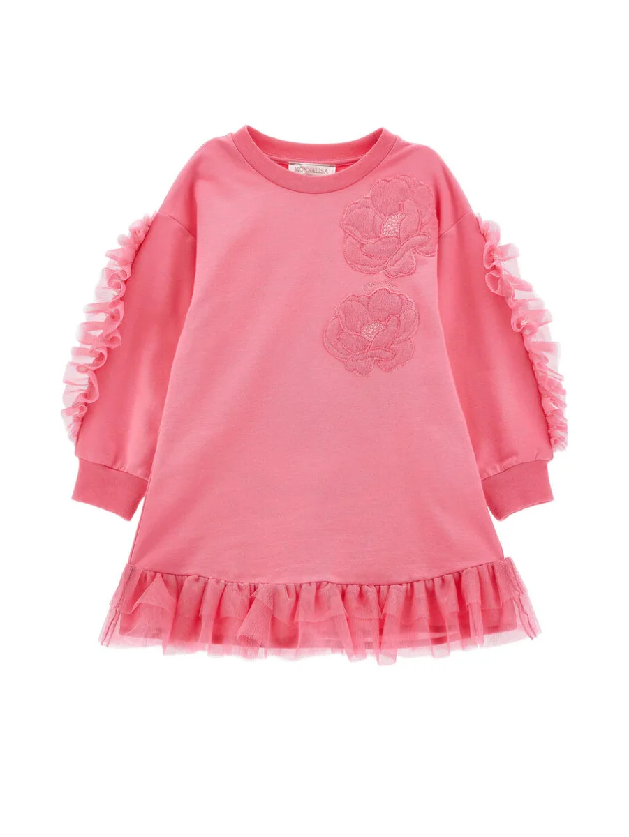 Questo delicato abito in felpa รจ realizzato con un morbido e piacevole jersey di cotone a fibre lunghe, arricchito da un tocco di elastan per una vestibilitร perfetta. Gli ampi anemoni ricamati sul davanti, impreziositi dal logo del brand, si incontrano armoniosamente con le voluminose balze trasparenti in tulle che adornano maniche e orlo. La […]