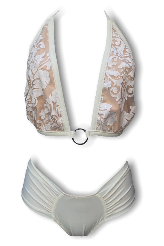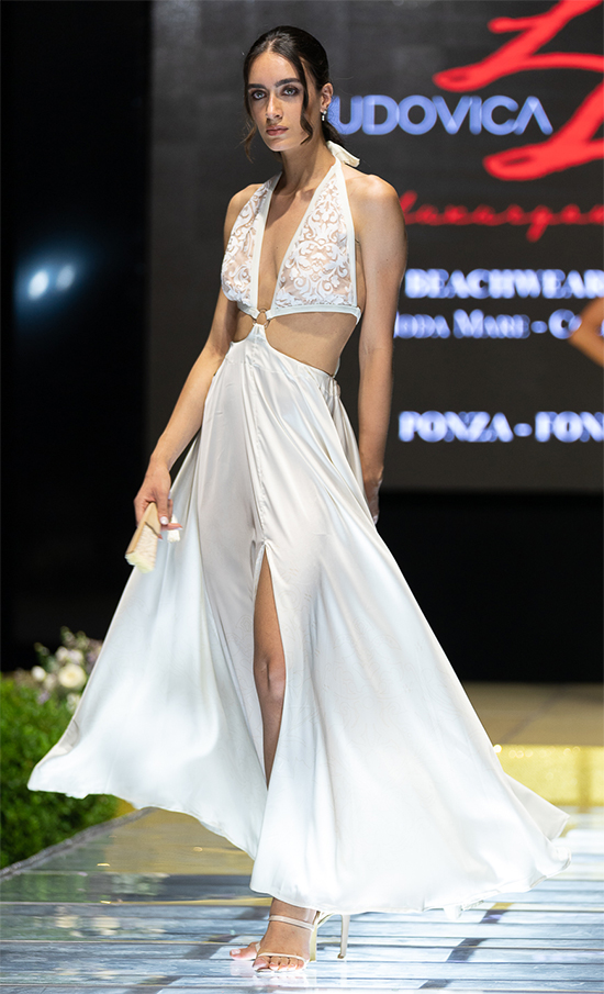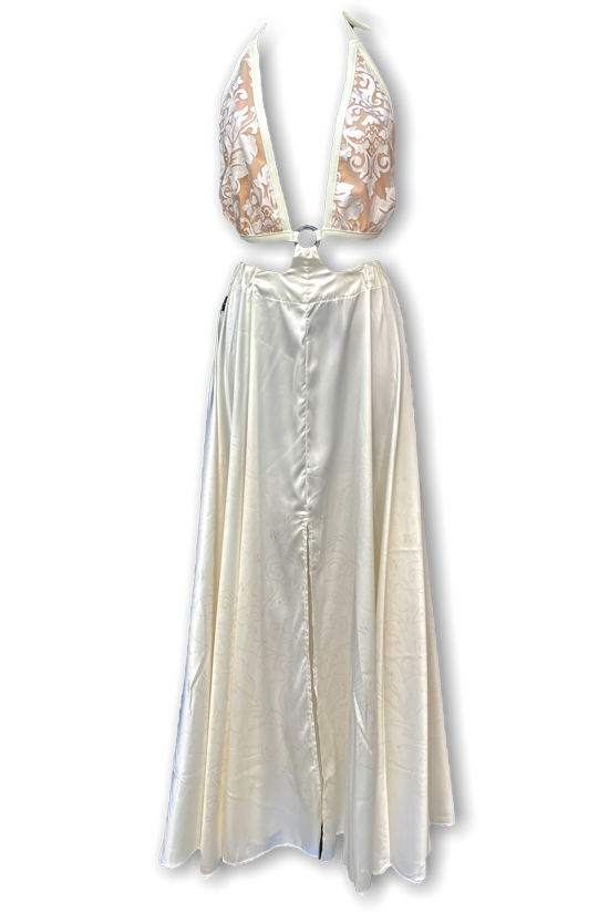 Abito Lamante Bridal con grande spacco, glamour e chic. Perfetto per un’incantevole serata estiva o per farti notare ad un party! Sul fondo la gonna รจ decorata un’elegante stampa esclusiva firmata Ludovica L’Amante. Il top puรฒ essere separato dalla gonna, cosรฌ da poterlo utilizzare come costume abbinandolo con i nostri slip della collezione Bridal avorio Indossandolo ti sentirai unica e stupenda!