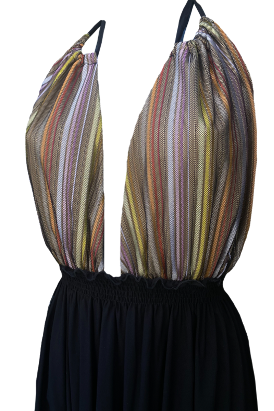 Abito Lamante scollato con spacco, romantico, glamour e chic. Puoi cambiare la scollatura a tuo piacimento. Il top รจ in tulle laminato a righe, foderato in color carne. Perfetto per un’incantevole serata estiva o per farti notare ad un pool party! Indossandolo ti sentirai unica e stupenda! Disponibile in diverse varianti.