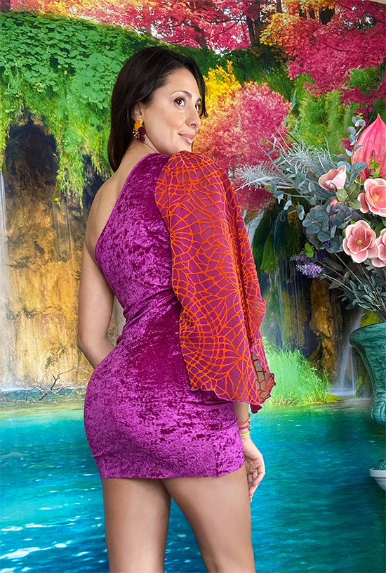 L’abito Petra nella variante butterfly, mono spalla con manica in chiffon, profonda scollatura e coulisse, in morbida e sensuale lycra vellutata.