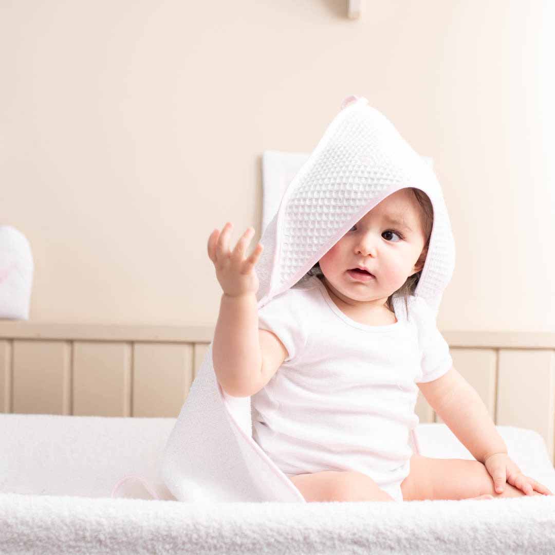 Adatto a bambini da 0 a 5 mesi circa. Telo quadrato di spugna con cappuccio in nido d’ape, fatto a triangolo.In morbida spugna bianca – 100% cotone.Molto soffice ed assorbente, si lava in lavatrice fino a 40°. Dettaglio in nido d’ape. Misura: 60 x 60 cm.