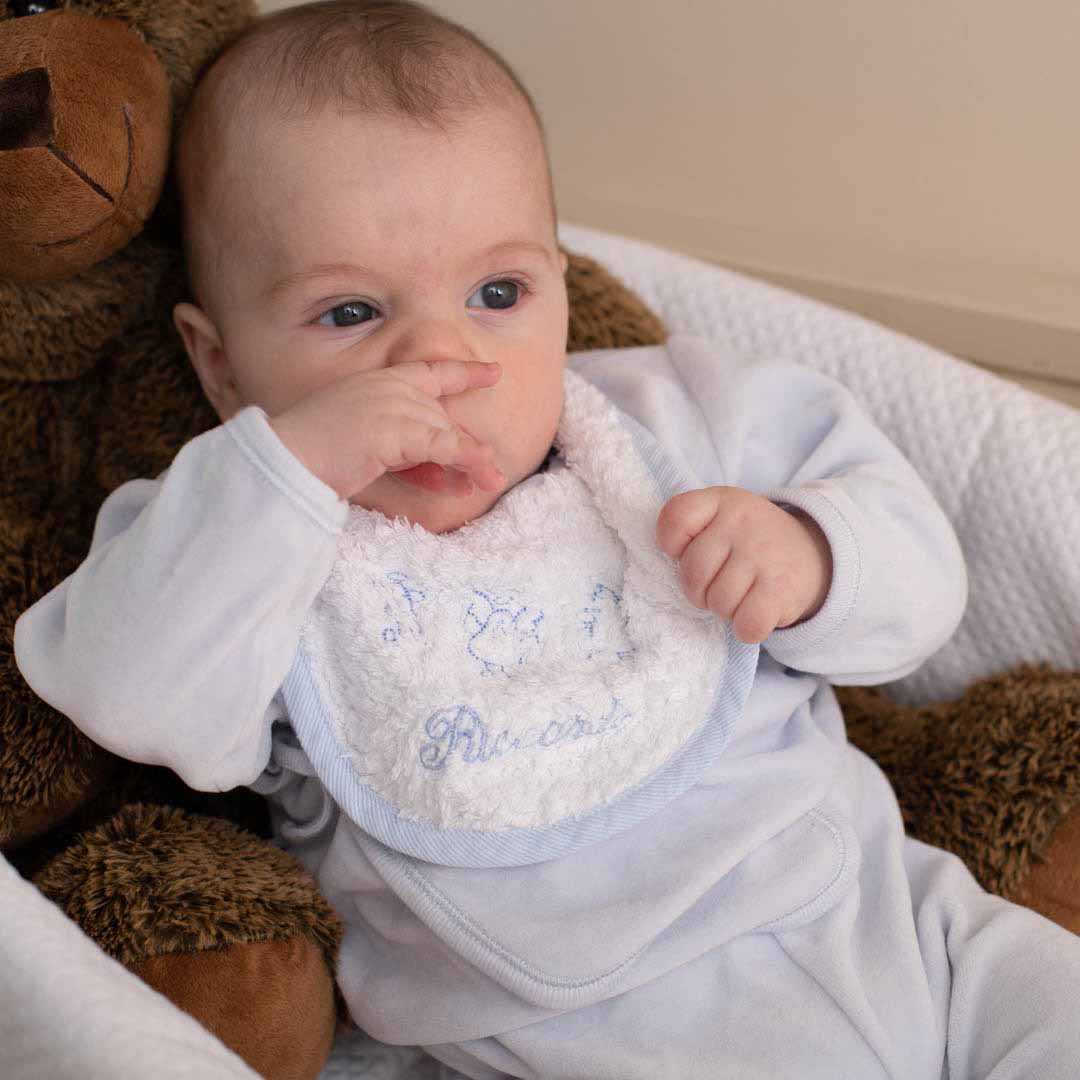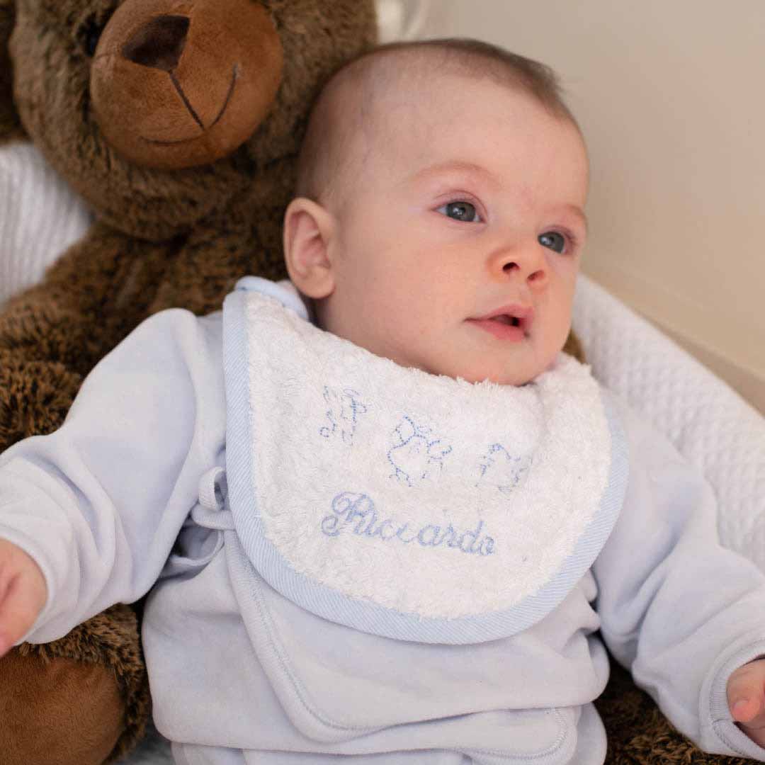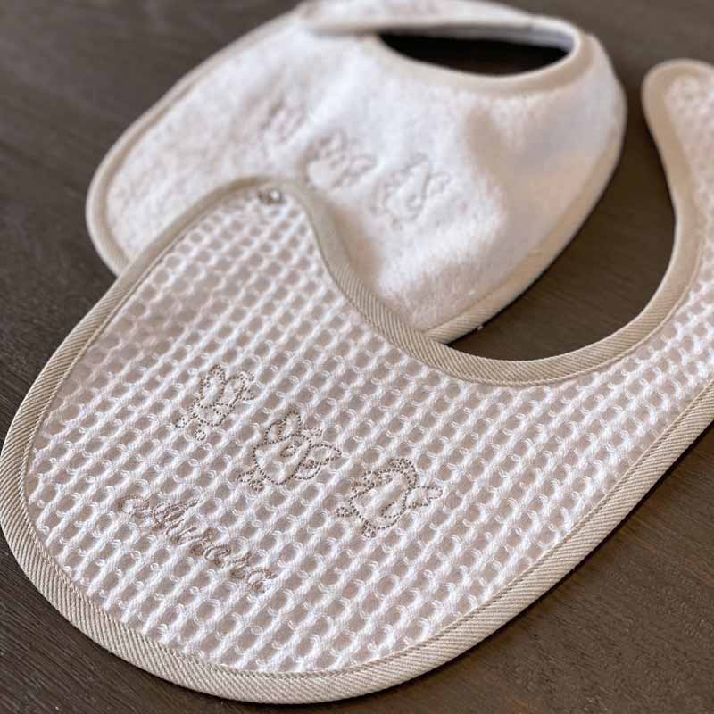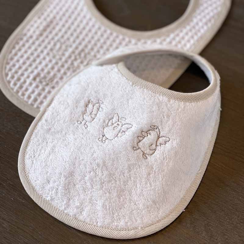 Adatto a bambini da 0 a 4 mesi. Si chiude lateralmente tramite un pratico automatico, nikel free. In morbida spugna o nido d’ape – 100% cotone. Molto soffice ed assorbente, si lava in lavatrice fino a 40°.