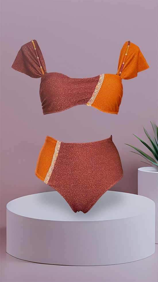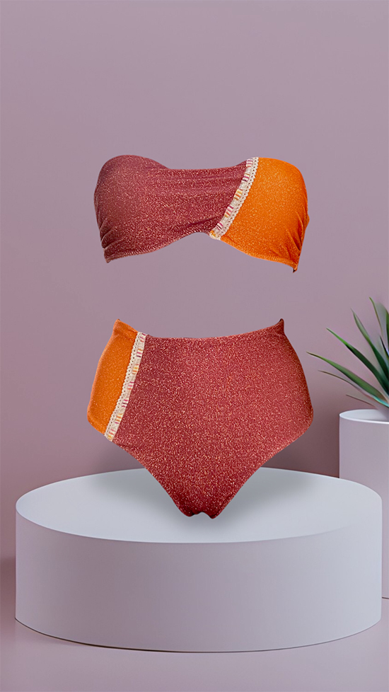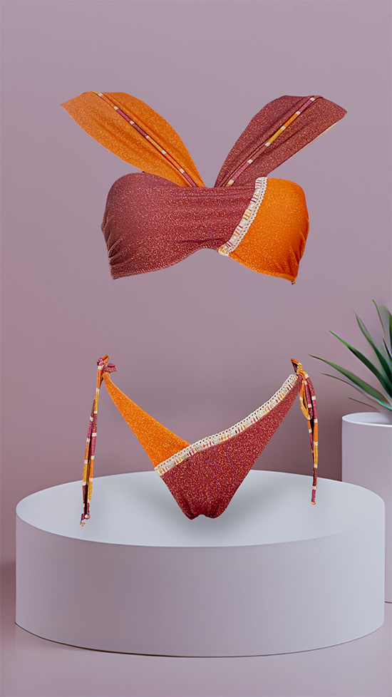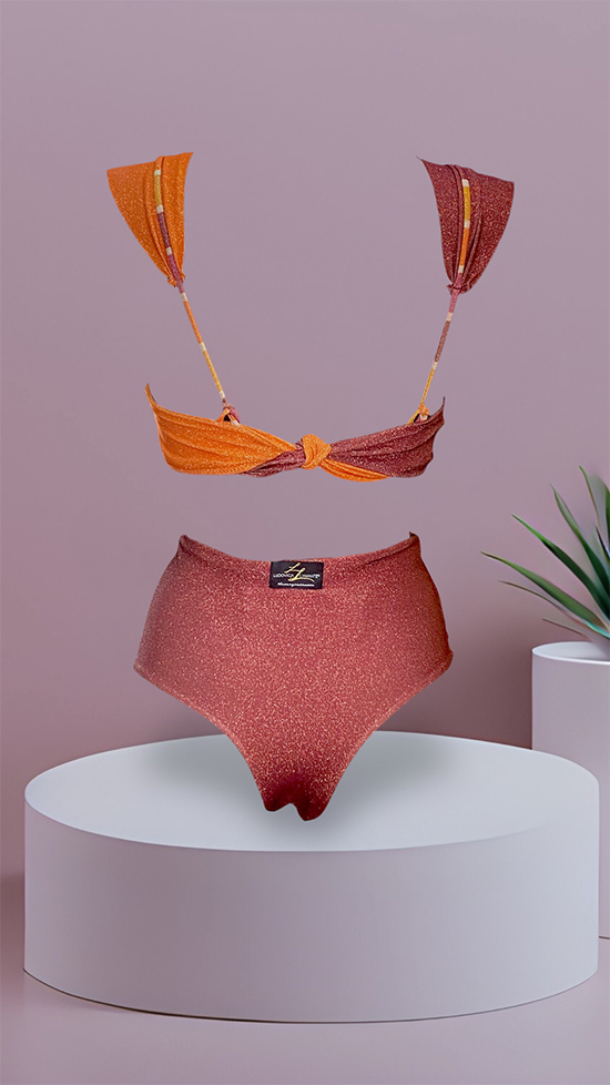 Scintillante ed unico, il bikini dei tuoi sogni potrai crearlo iniziando da questo top bikini alba nella variante bicolor in maglina lurex arancione e bordeaux. La nostra esclusiva lavorazione a mano ci permette di realizzare la coppa perfetta che valorizza il tuo decoltรจ qualsiasi taglia sia: infatti per i seni piรน piccoli all’interno ci sarร una coppetta push-up che li aumenterร di una taglia e per quelli piรน grandi la coppa all’interno sarร rigida e con struttura adeguata a sostenere un peso maggiore. Le bretelle sono regolabili e rimovibili. Scegli infine lo slip piรน adatto a te e alle tue esigenze:ย la brasiliana aria bicolor, sgambatura sempre di tendenza, con laccetti regolabili sui fianchi, per non passare inosservata; la Coulotte bicolor, per chi ama lo slip a vita alta sempre di tendenza, con particolaritร della passamaneria sul davanti. CONTATTACI NELLA FINESTRA WHATSAPP PER AVERE UNA CONSULENZA E CREARE IL MIX GIUSTO PER TE!