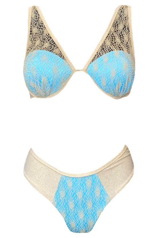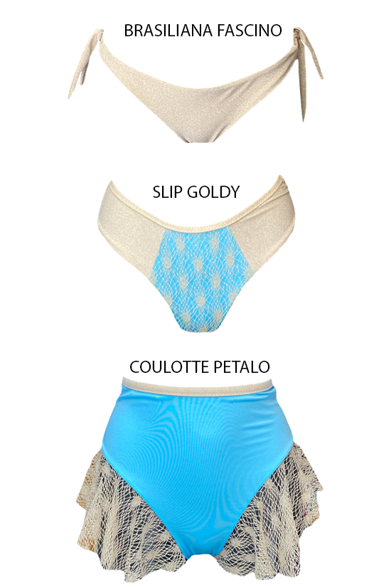 Crea il bikini perfetto per te iniziando da questo top con coppa della quale non potrai piรน farne a meno. La nostra esclusiva lavorazione a mano ci permette di realizzare la coppa perfetta che valorizza il tuo decoltรจ qualsiasi taglia sia: infatti per i seni piรน piccoli all’interno ci sarร una coppetta push-up che li aumenterร di una taglia e per quelli piรน grandi la coppa all’interno sarร rigida e con struttura adeguata a sostenere un peso maggiore. La rete oro sovrapposta alla lycra celeste crea un elegante e romantico contrasto. Scegli infine lo slip piรน adatto a te e alle tue esigenze: lo slip Goldy, sgambatura dietro coprente, con dettaglio centrale a contrasto en pendant con la coppa, per chi ama la comoditร e la semplicitร . Lo slip brasiliana fascino Goldy con sgambatura sempre di tendenza, con laccetti regolabili sui fianchi, sbarazzino e romantico per non passare inosservata. Infine la coulotte alta Petalo Goldy, con il volant- gonnellino, a vita alta per chi ama questa tendenza anni 50 dal gusto retrรฒ-chic per chi vuole essere in spiaggia o in barca la regina della vacanza.