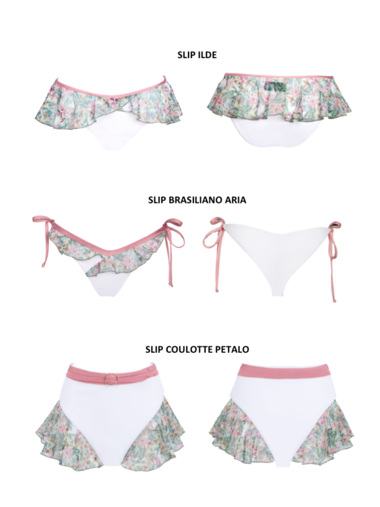 Crea il bikini perfetto per te iniziando da questo top a fascia della quale non potrai piรน farne a meno. La nostra esclusiva e innovativa struttura interna valorizzerร i seni piรน piccoli e sosterrร in modo magico i seni piรน grandi, dimentica le fastidiosissime bretelle a cui sei stata fino ad ora abituata. Il semplice laccio centrale removibile, qui in versione petalo, ti consente di muoverti e nuotare con piu disinvoltura, scegliendo di legarlo dietro il collo o dietro le spalle. Scegli infine lo slip piu adatto a te e alle tue esigenze: lo slip brasiliano Aria, sgambatura sempre di tendenza, con laccetti regolabili sui fianci, sbarazzino e romantico per non passare inosservata, o lo slip Ilde con morbido voilant e sgambatura dietro coprente, per chi ama la comoditร e la semplicitร , o la coulotte alta Petalo, con la sua cintura e il voilant-gonnellino, a vita alta per chi ama questa tendenza anni 50 dal gusto retrรฒ-chic per chi vuole essere in spiaggia o in barca la regina della vacanza.