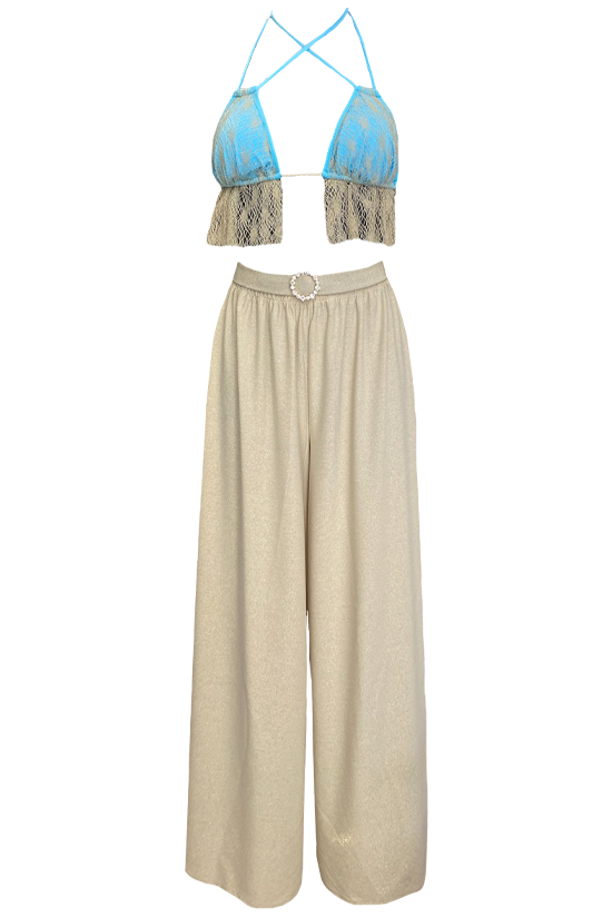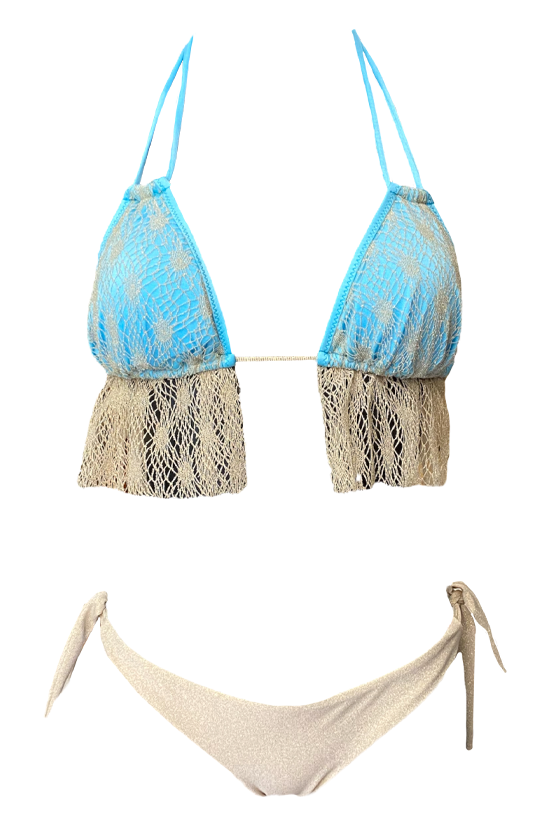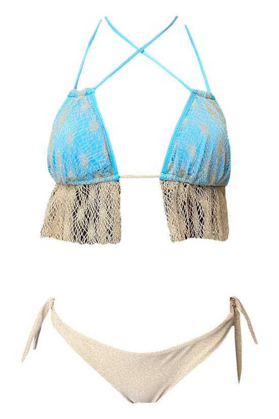 Crea il bikini dei tuoi sogni iniziando da questo elegante e romantico top bikini triangolo con coppa estraibile, ideale per i seni piccoli e medio-grandi per far risaltare il tuo dรฉcolletรฉ. Il dettaglio della rete oro, scivola delicatamente sotto il seno creando una balza. Scegli infine lo slip piรน adatto a te e alle tue esigenze: lo slip Goldy, sgambatura dietro coprente, con dettaglio centrale a contrasto en pendant con la coppa, per chi ama la comoditร  e la semplicitร . Lo slip brasiliana fascino Goldy con sgambatura sempre di tendenza, con laccetti regolabili sui fianchi, sbarazzino e romantico per non passare inosservata. Infine la coulotte alta Petalo Goldy, con il volant- gonnellino, a vita alta per chi ama questa tendenza anni 50 dal gusto retrรฒ-chic per chi vuole essere in spiaggia o in barca la regina della vacanza.
