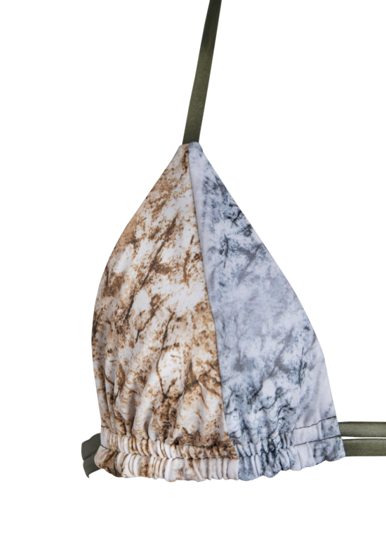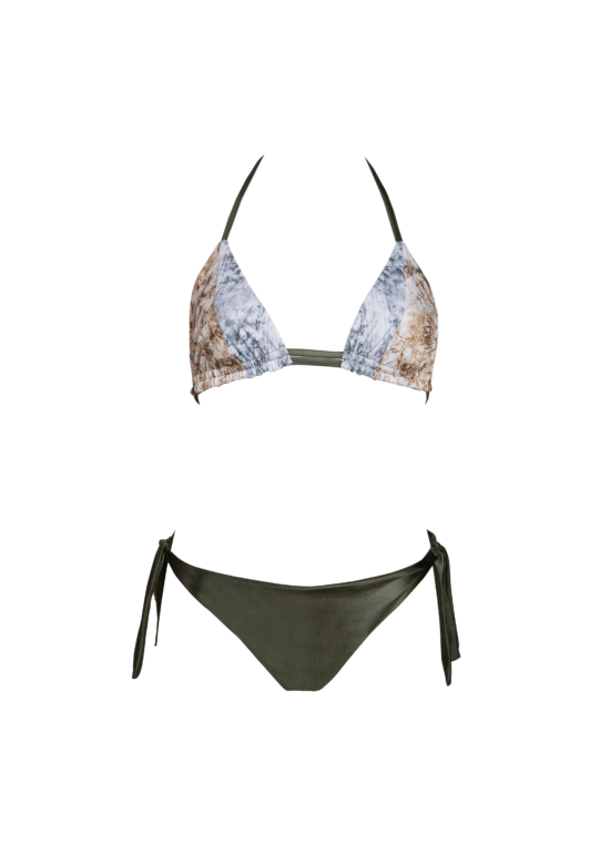 Crea il bikini dei tuoi sogni iniziando da questo frizzante top bikini triangolo con doppio laccio e coppa estraibile, ideale per i seni piccoli e medio-grandi per far risaltare il tuo dรฉcolletรฉ. L’intrigante tessuto effetto pelle accostato a colori eleganti e classici rende questa linea incredibilmente unica. Linea senza etร , un classico rivisitato, dai tagli comodi e veloci. Tessuti e stampe ispirate alla natura, dai toni della terra, del cielo e della roccia. Scegli infine lo slip piu adatto a te e alle tue esigenze: lo slip dal taglio brasiliano con i fiocchi sui lati, sempre di gran tendenza, semplice adatto a chi ama un’abbronzatura perfetta, lo slip Kate, nostro best seller, adatto a tutte le taglie per la ua sgambatura sul dietro differente e su misura, che va da sgambata a coprente.