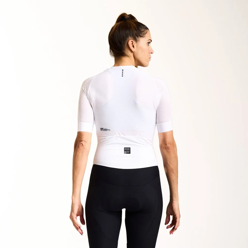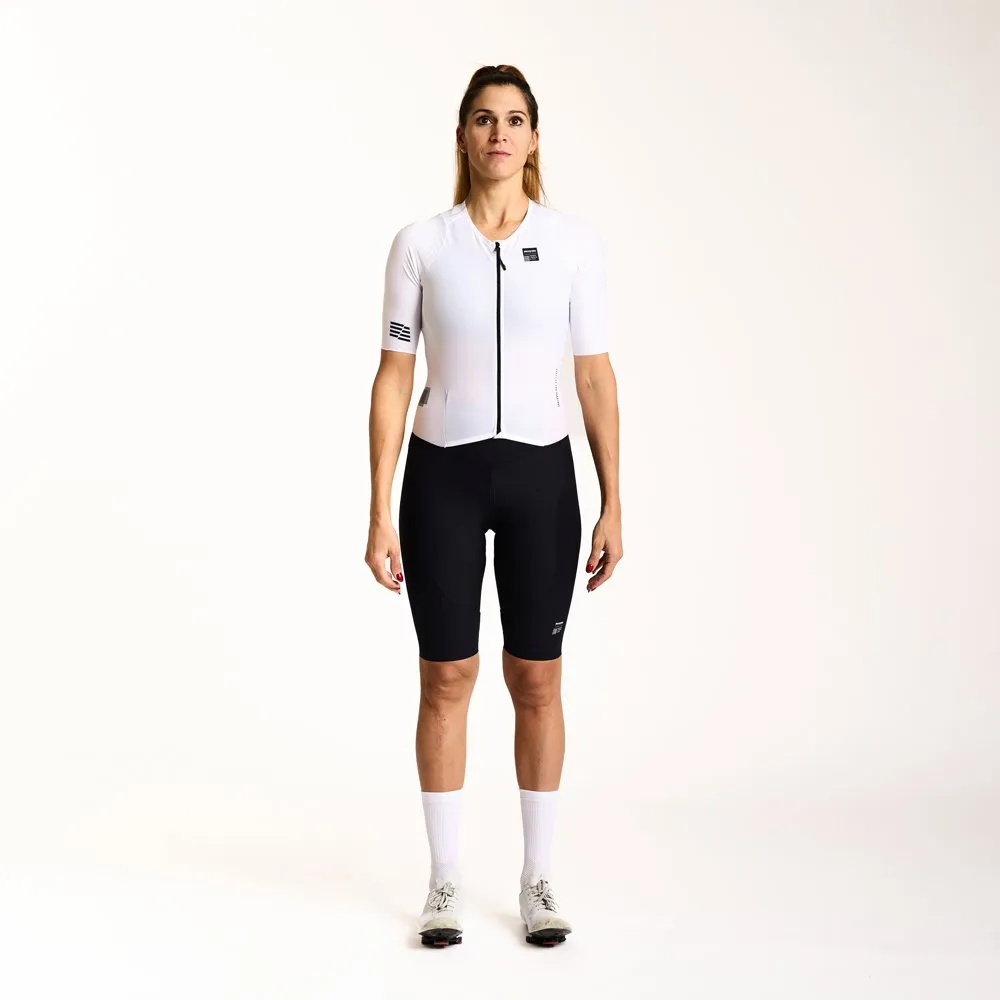 La parte anteriore , conpletamente apribile ,รจ realizzata in tessuto tecnico altamente traspirante e leggero che dona una sensazione di comfort come una seconda pelle, con maniche a taglio vivo avvolgenti e morbide. Parte bassa con fine gamba a taglio vivo per una vestibilitร e aderenza ottimale. Tre tasche posteriori in materiale elasticizzato e forato.