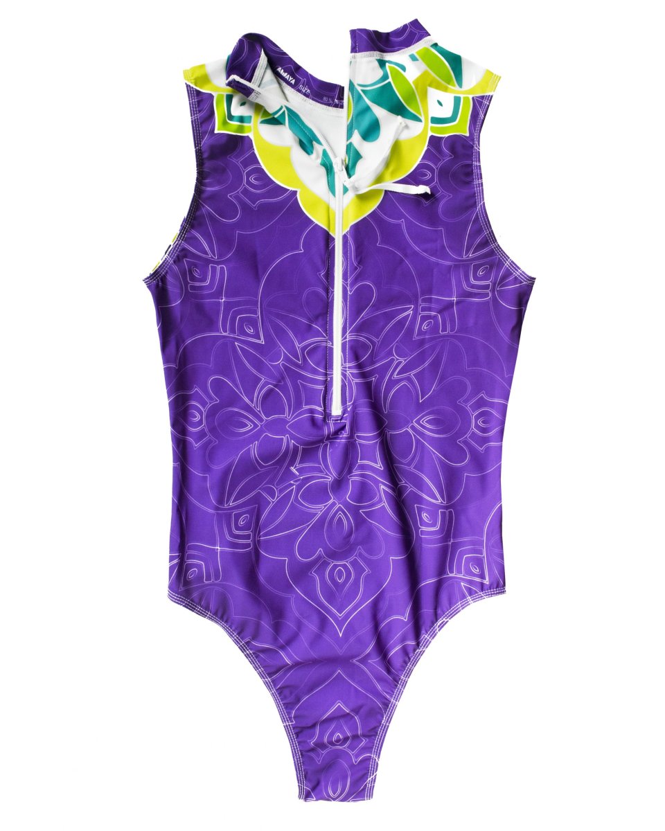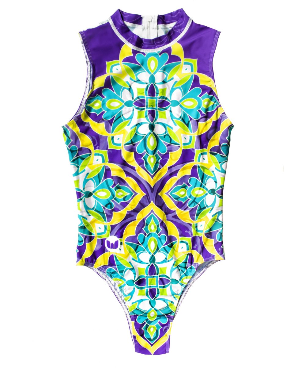 Bodysuit in lycra smanicato, interamente sublimato, con zip posteriore e cordoncino per una facile apertura. Adatto per gli sport d’acqua, asciugatura rapida. Vestibilitá Fit