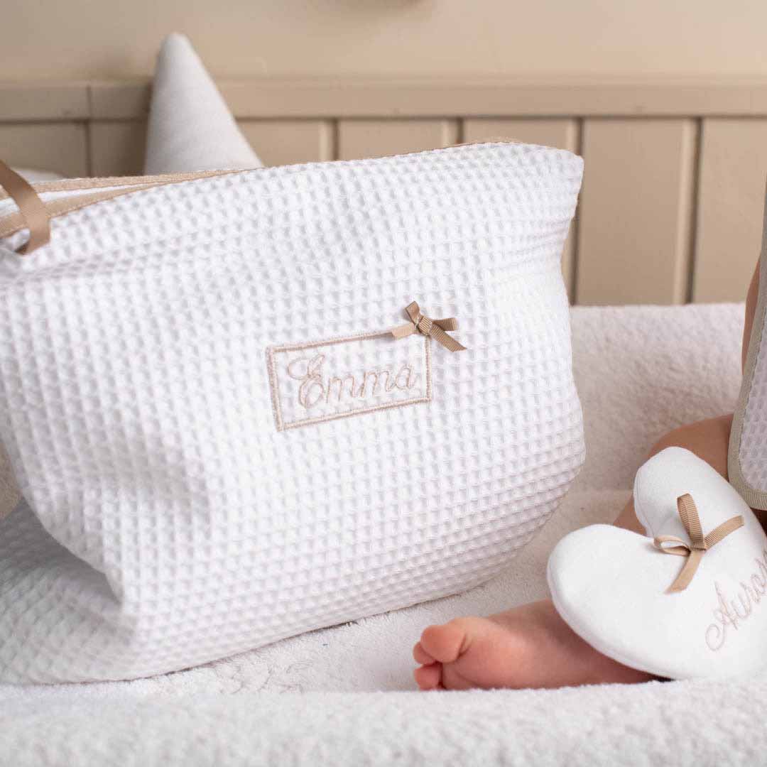 Busta rettangolare in nido d’ape. Chiusura con zip. Ben si adatta a tutte le situazioni perché vi si possono mettere capi bagnati all’interno.In nido d’ape 100% cotone esternamente; in tessuto impermeabile internamente. Si lava in lavatrice fino a 40°. Pratica anche come busta per il cambio da portare in ospedale per il parto.