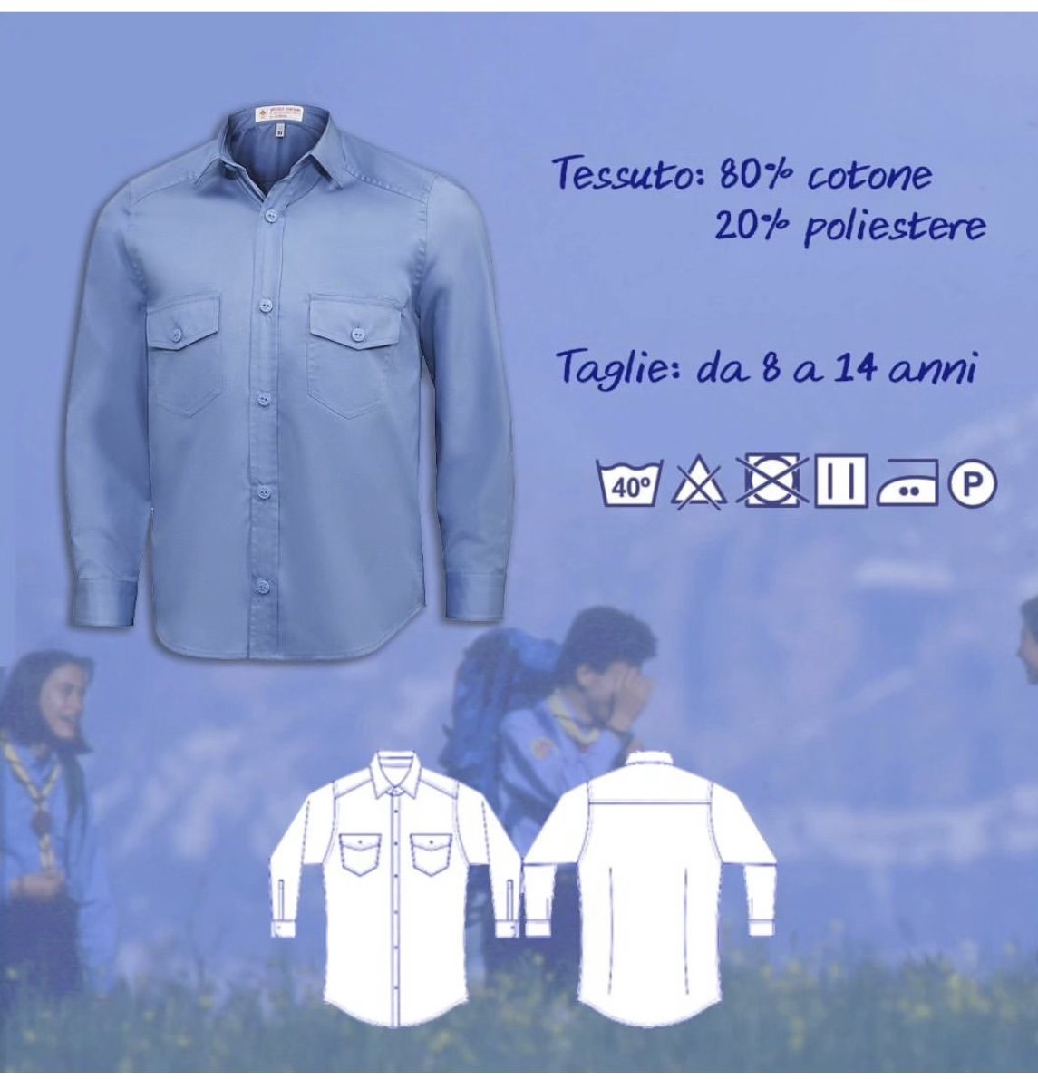 La camicia junior (bambino/bambina) dellโuniforme scout ufficiale dellโAssociazione Guide e Scouts Cattolici Italiani.