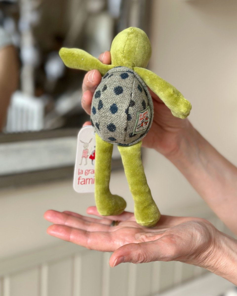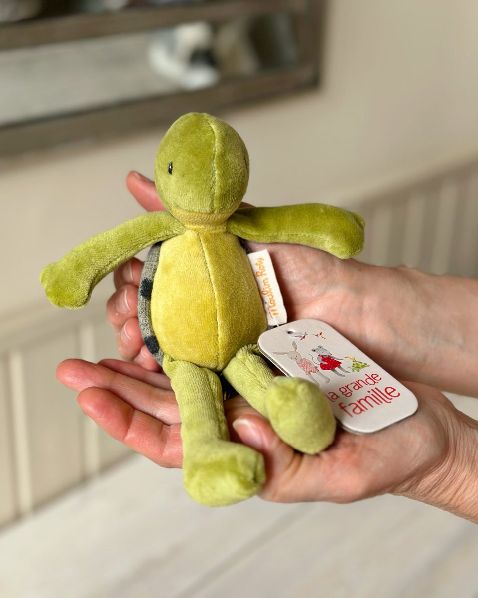 Peluche Camilla la tartaruga della misura i piccoli della collezione La grande famiglia di Moulin Roty. Morbido e dolce, un compagno tenero per il tuo bambino con zampe lunghe da afferrare. Realizzato in morbido velluto e ha un guscio morbido a pois.