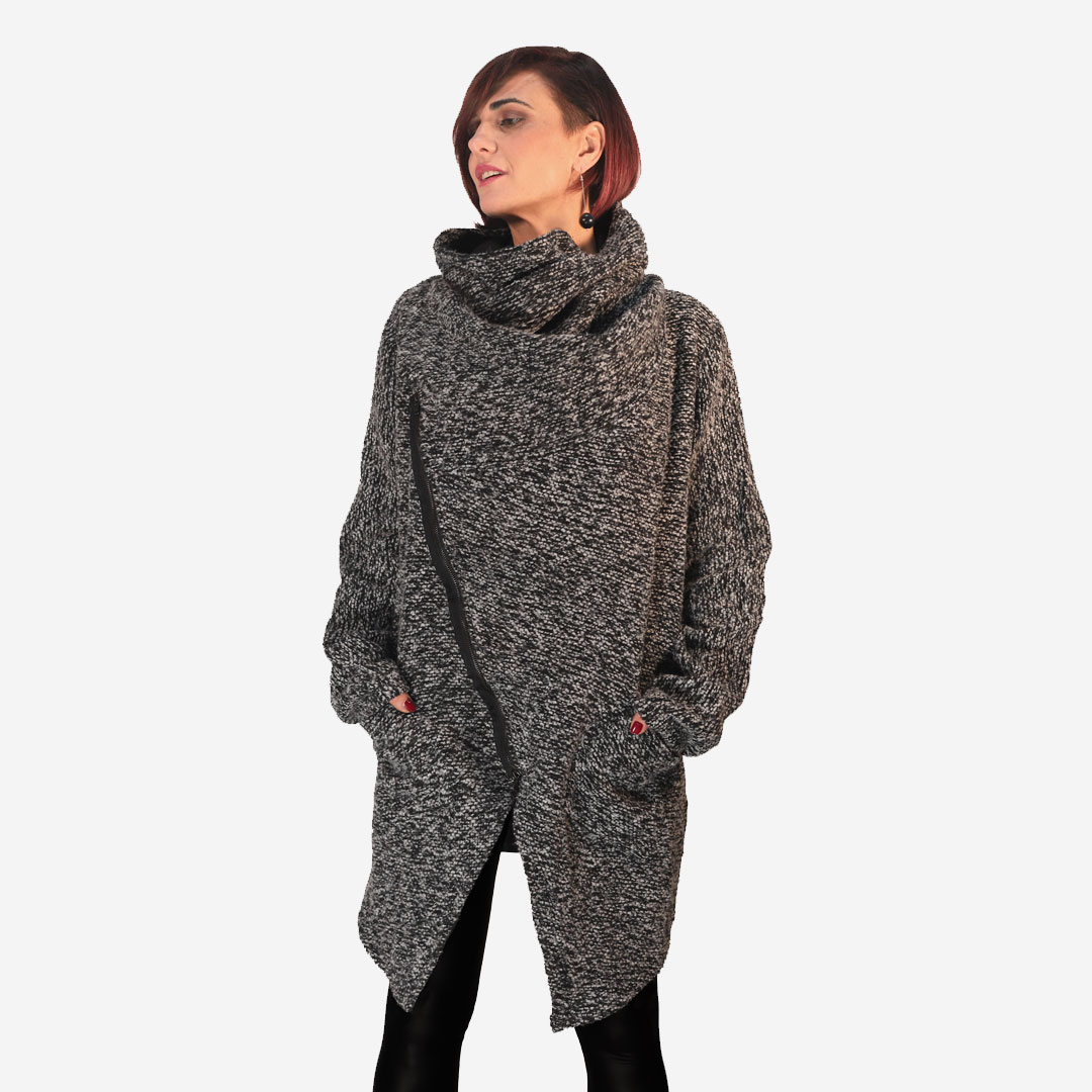 Cappotto biker con zip trasversale e tashe, tessuto effetto bouclé, grigio melange.