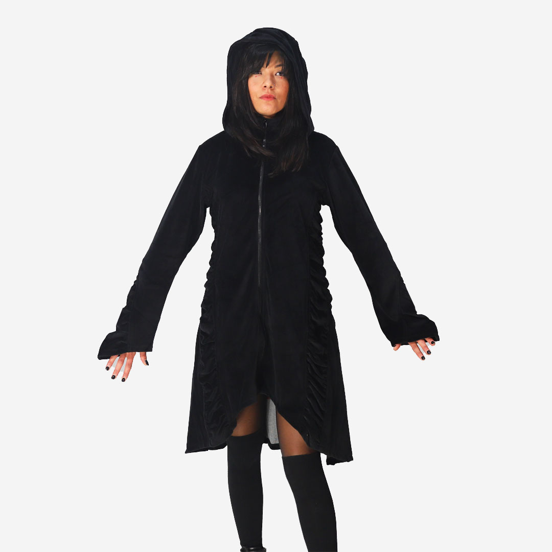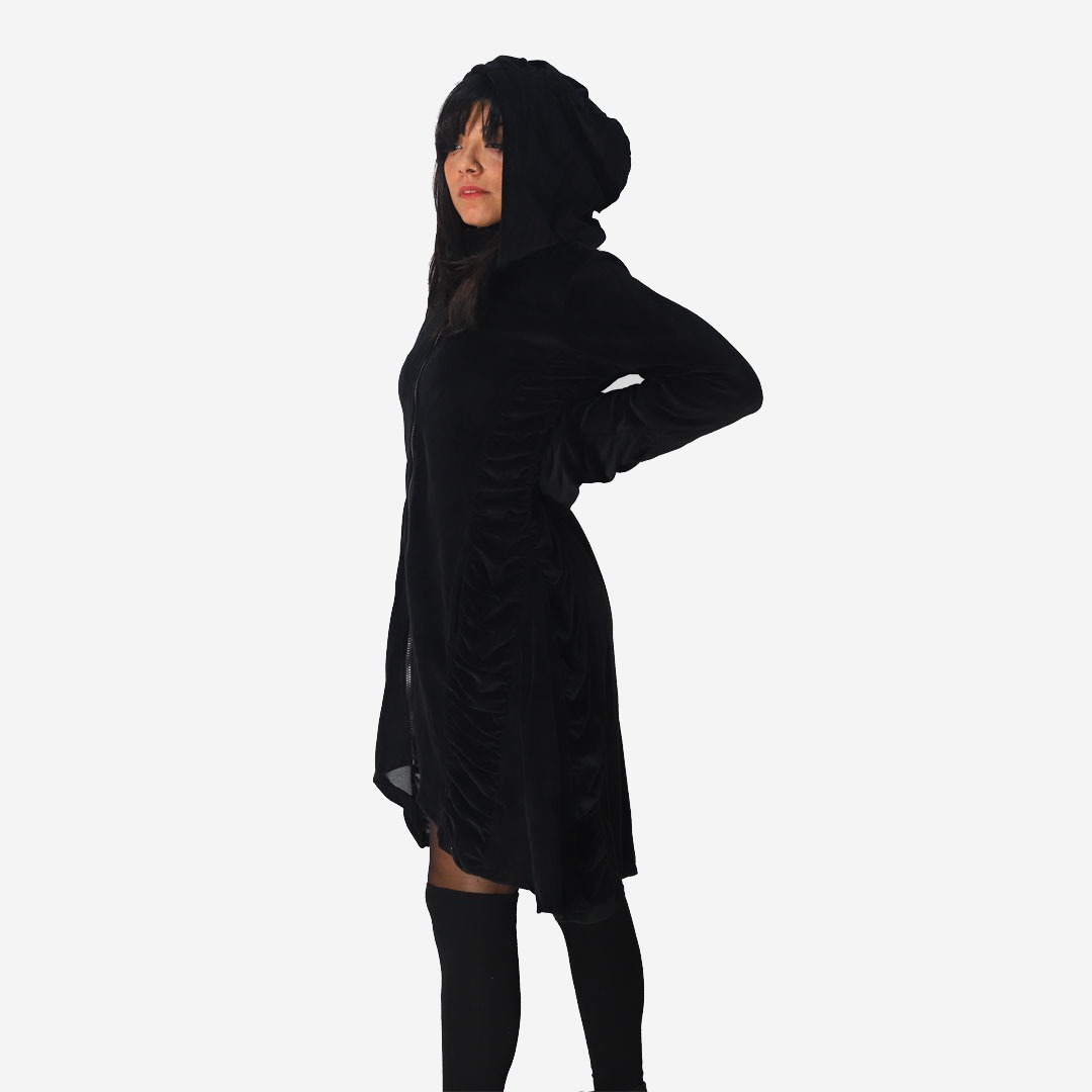 Cappotto/ vestito collo alto in velluto, con zip e ampio cappuccio removibile, maniche a campana e tasche a filo. Asimmetrico : corto avanti e lungo dietro. Per uno stile dark new gothic, steampunk. Puoi indossarlo come vestito o soprabito. Materiale: 100% cotoneย ย Consigli di lavaggio: 30ยฐ max
