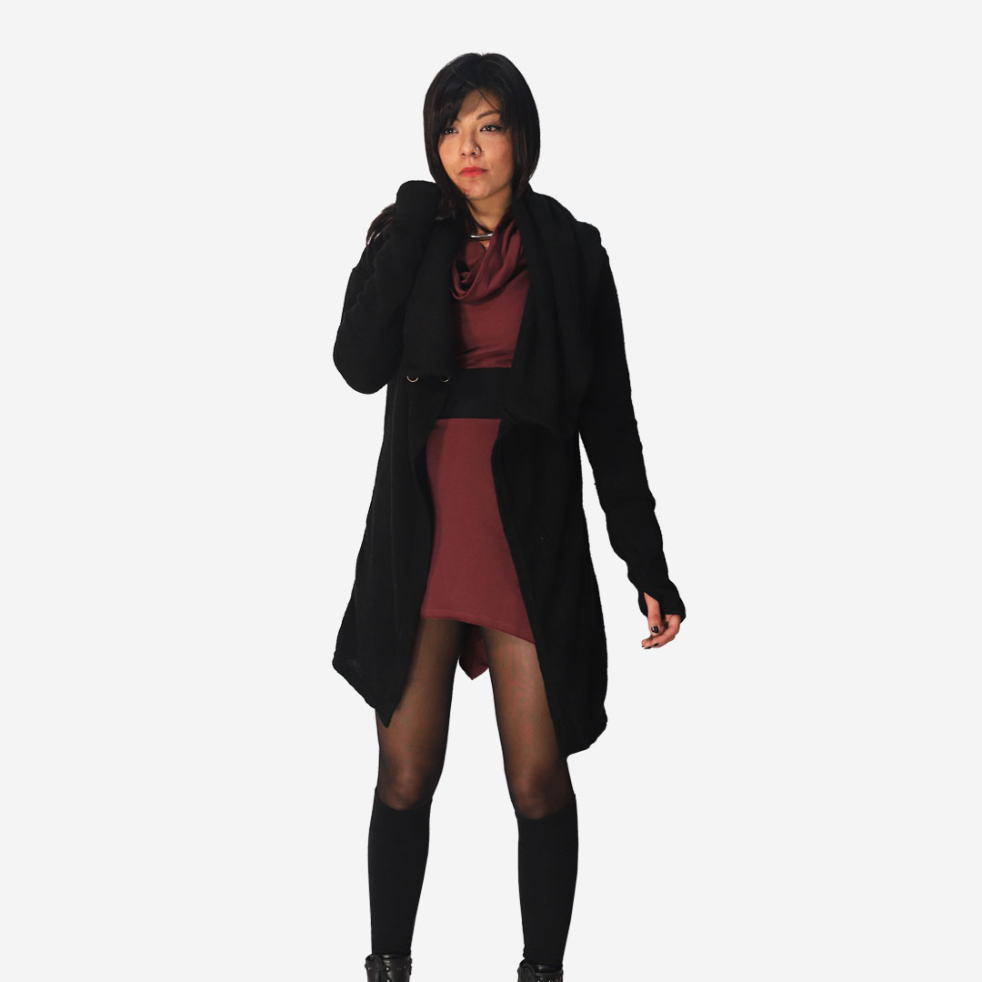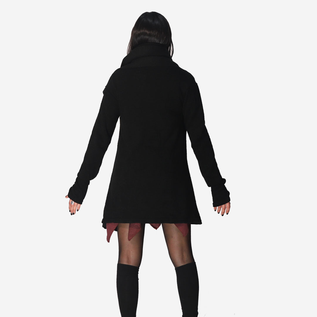 Cardigan mantella tinta unita, con ganci, con ampio collo in tessuto doppiato che diventa un comodo cappuccio, fori per i pollici all’estremità della manica. Si chiude con due ganci color ottone.