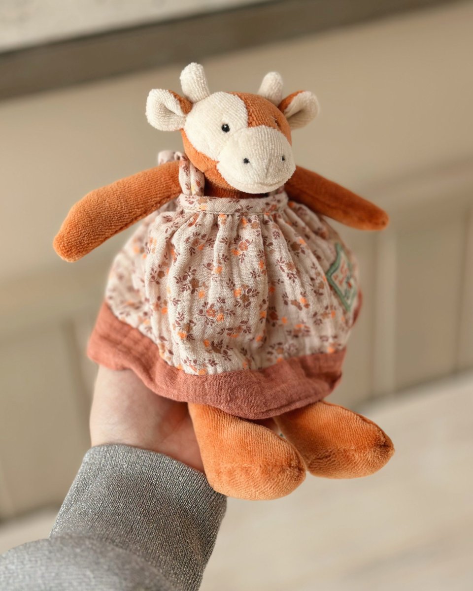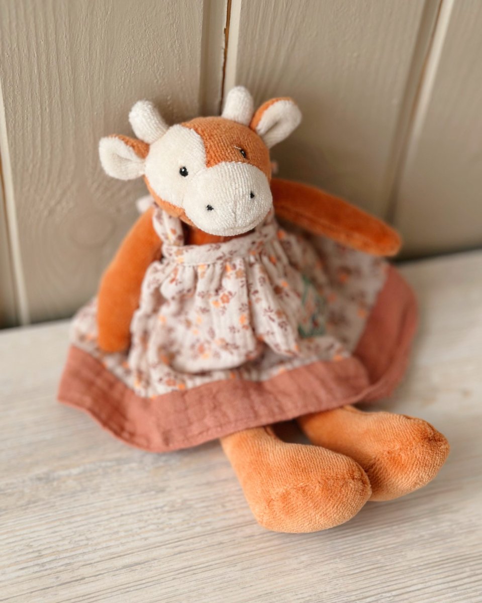 Peluche Charlotte la mucca della misura i piccoli della collezione La grande famiglia di Moulin Roty. In velluto con un morbido viso ricamato, facile da afferrare per le manine. Con le sue piccole corna in testa e il suo grazioso vestito floreale, Charlotte la mucca è l’amica ideale per condividere teneri momenti di legame con il bambino.