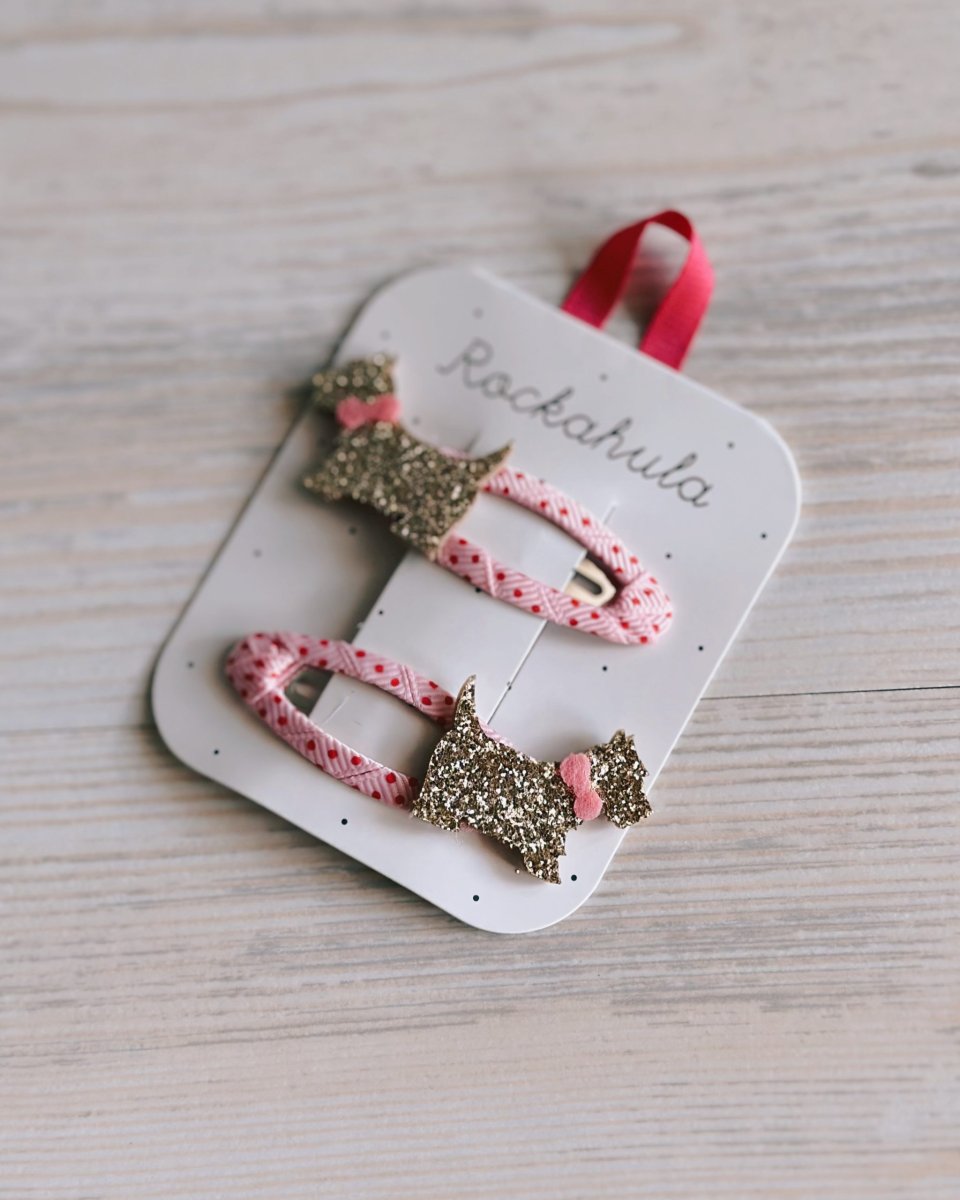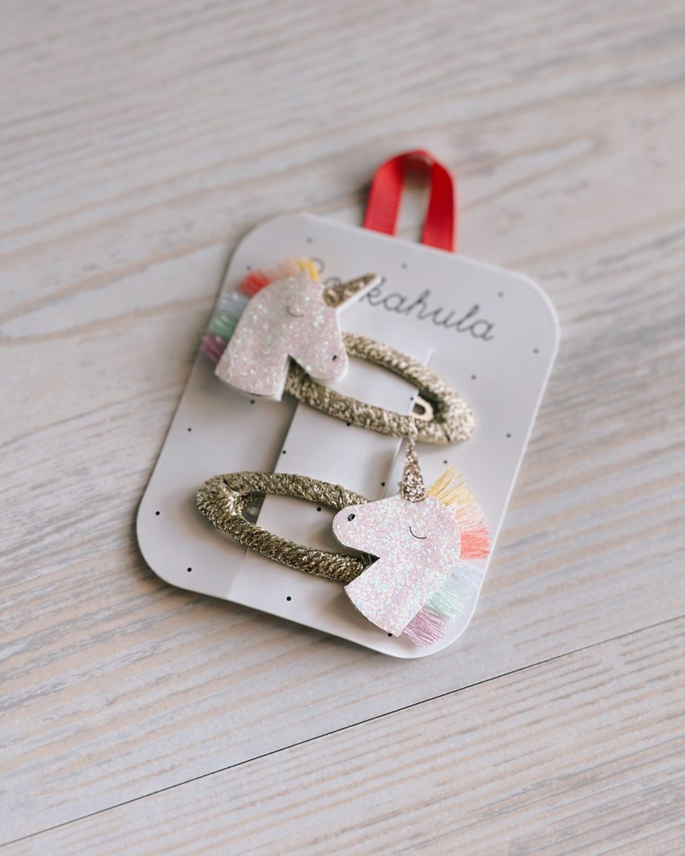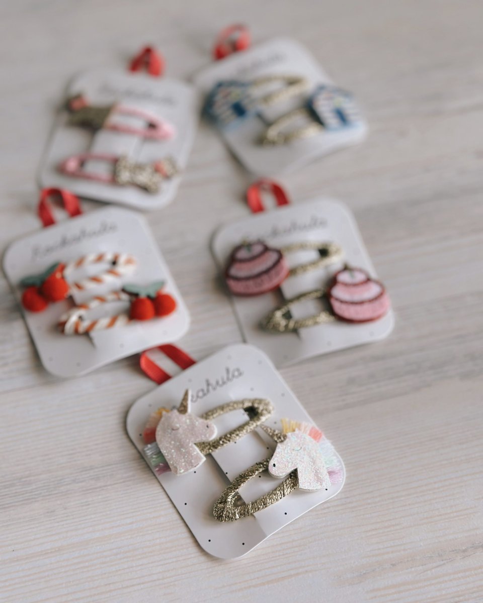 Set coppie di pinzette brillanti e colorate. Ogni applicazione è fissata ad una clip a pressione rivestita. Aggiungi un tocco di allegria ai tuoi capelli con i fermagli di Rockahula.