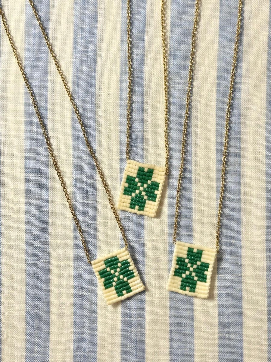 Collana fatta a mano a telaio, misura regolabile circa 50cm. Catenina in argento dorato. Ricamo in perline di vetro misura 1cm per 2cm