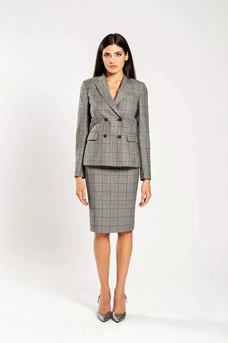Un capo dalle linee confortevoli interpretato da un tessuto principe di Galles in lana, giusto compromesso di eleganza e stile. Composto da una giacca a doppiopetto e da una gonna a tubino, la raffinata fantasia conferisce dinamismo, mentre gli elementi stilistici, come le tasche tagliate con aletta ed il rever a lancia, comunicano ricercatezza. Il connubio di perfezione per la donna in cerca di successo.