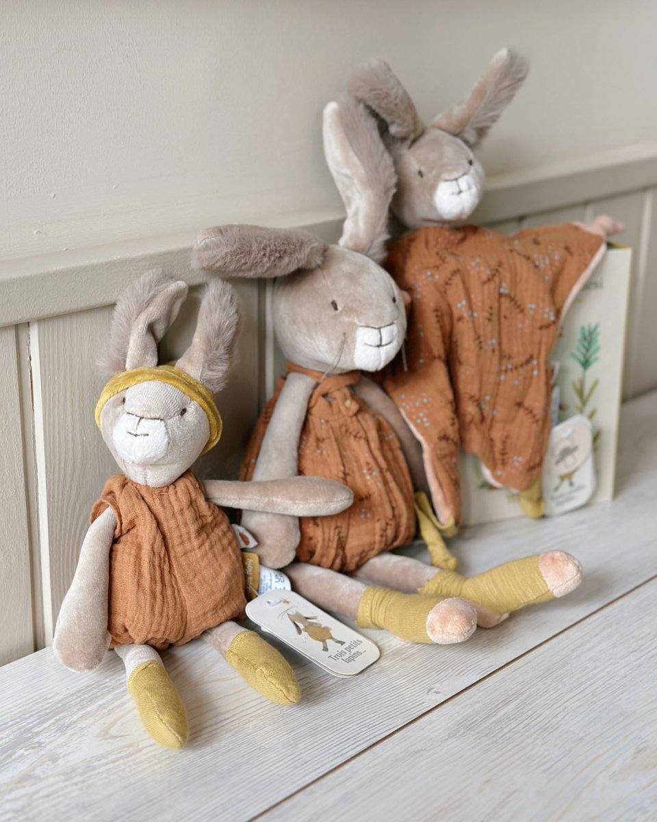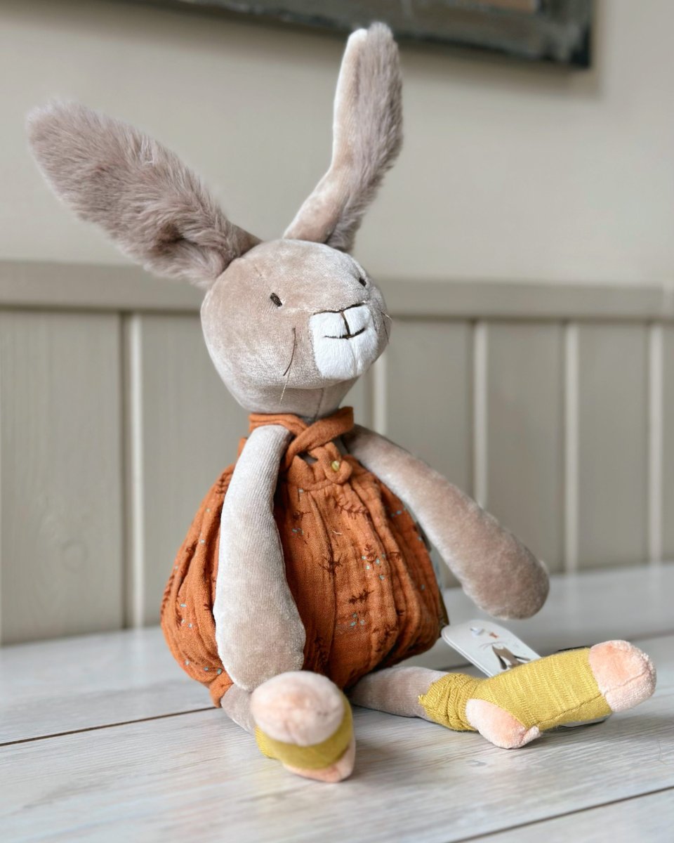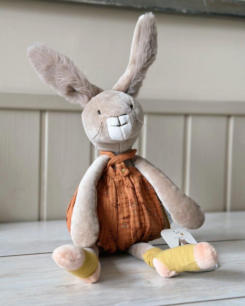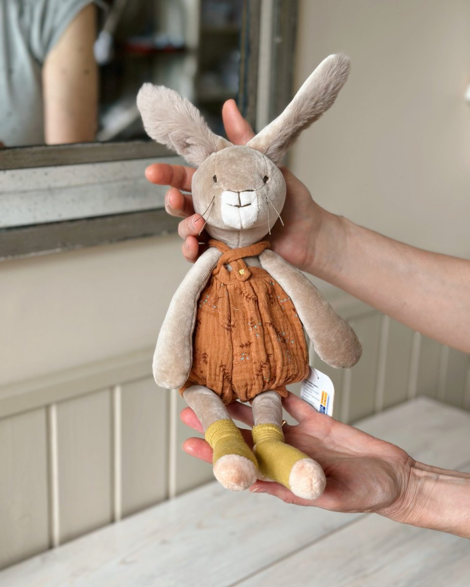Delizioso e morbidissimo coniglietto di Moulin Roty nelle tonalità della terra. Simpatico e morbidissimo, con orecchie di peluches.