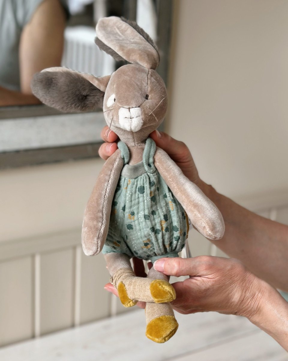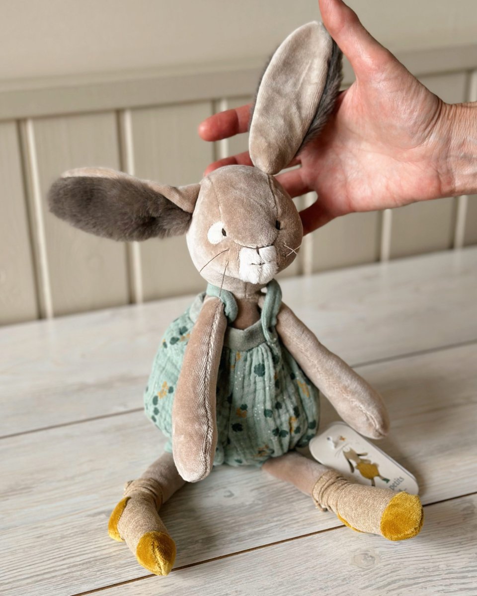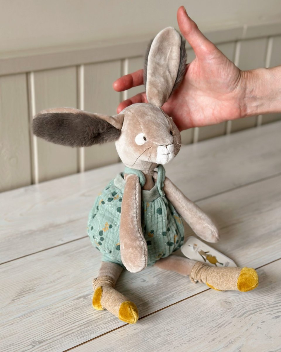 Delizioso e morbidissimo coniglietto di Moulin Roty nelle tonalità del verde salvia. Simpatico e morbidissimo, con orecchie di peluches.