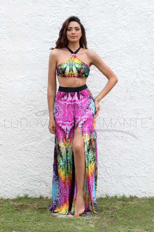 Un pantalone leggero e fresco, ti sembrerร di indossare una gonna lunga. Scegli se indossarlo con gli spacchi aperti o chiusi. Perfetto indossato per andare in spiaggia con il costume in coordinato o per un apericena con una blusa o un top. Impossibile passare inosservate, racchiude in sรฉ grinta e sensualitร .