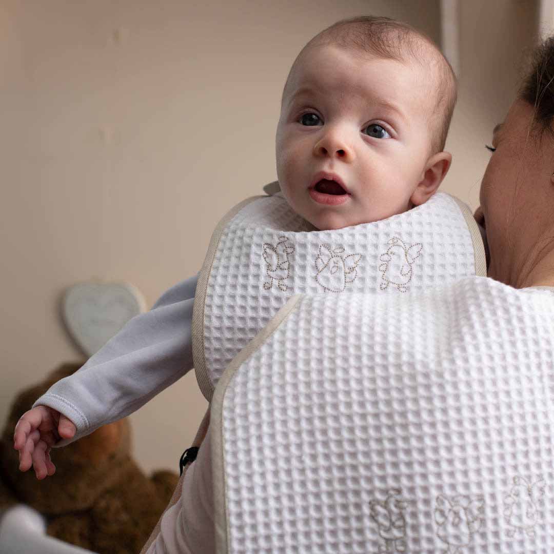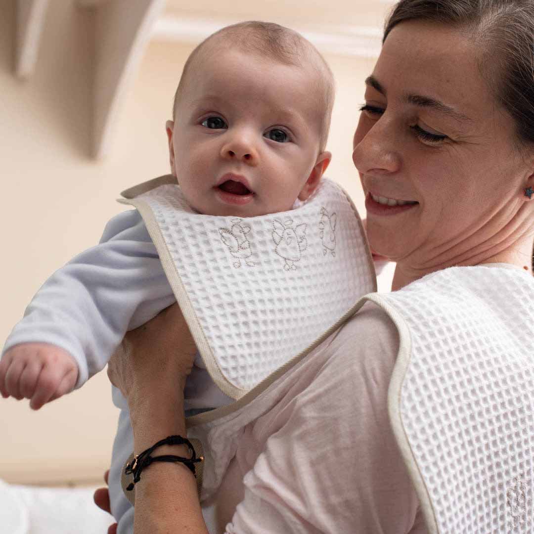 Indicato per proteggere gli indumenti della mamma dalle macchie di pappe e rigurgito. Grande e molto assorbente. Accompagna mamma e bambino fino al termine dell’allattamento. Pratico ed igienico. In morbida spugna o nido d’ape – 100% cotone. Molto piacevole al tatto, si asciuga velocemente. Si lava in lavatrice fino a 40°. Elegante e raffinato.