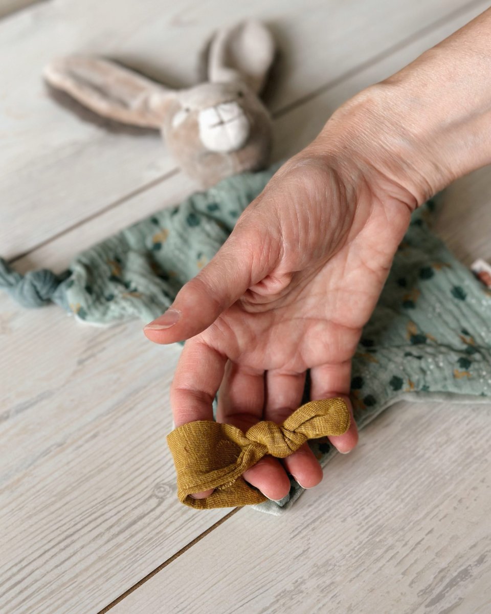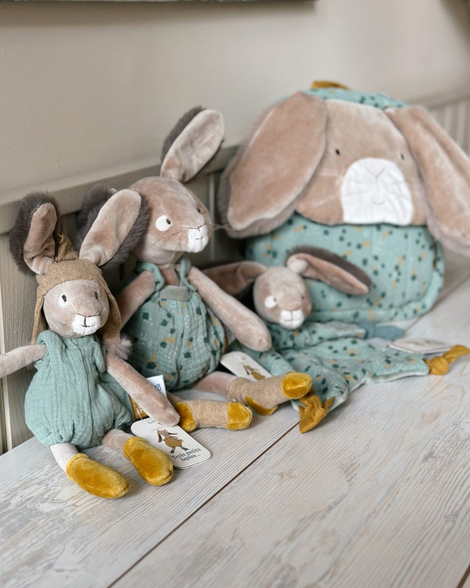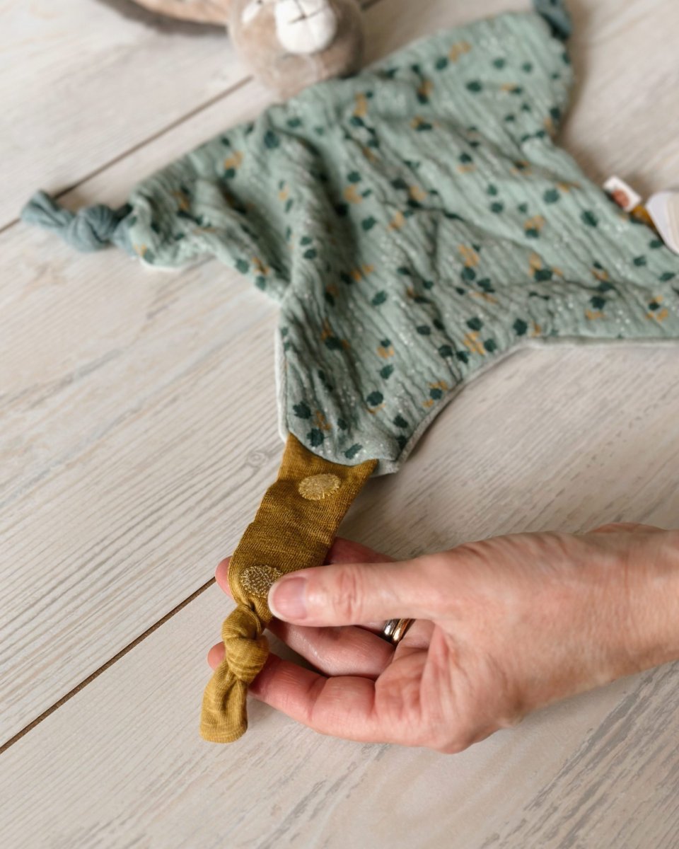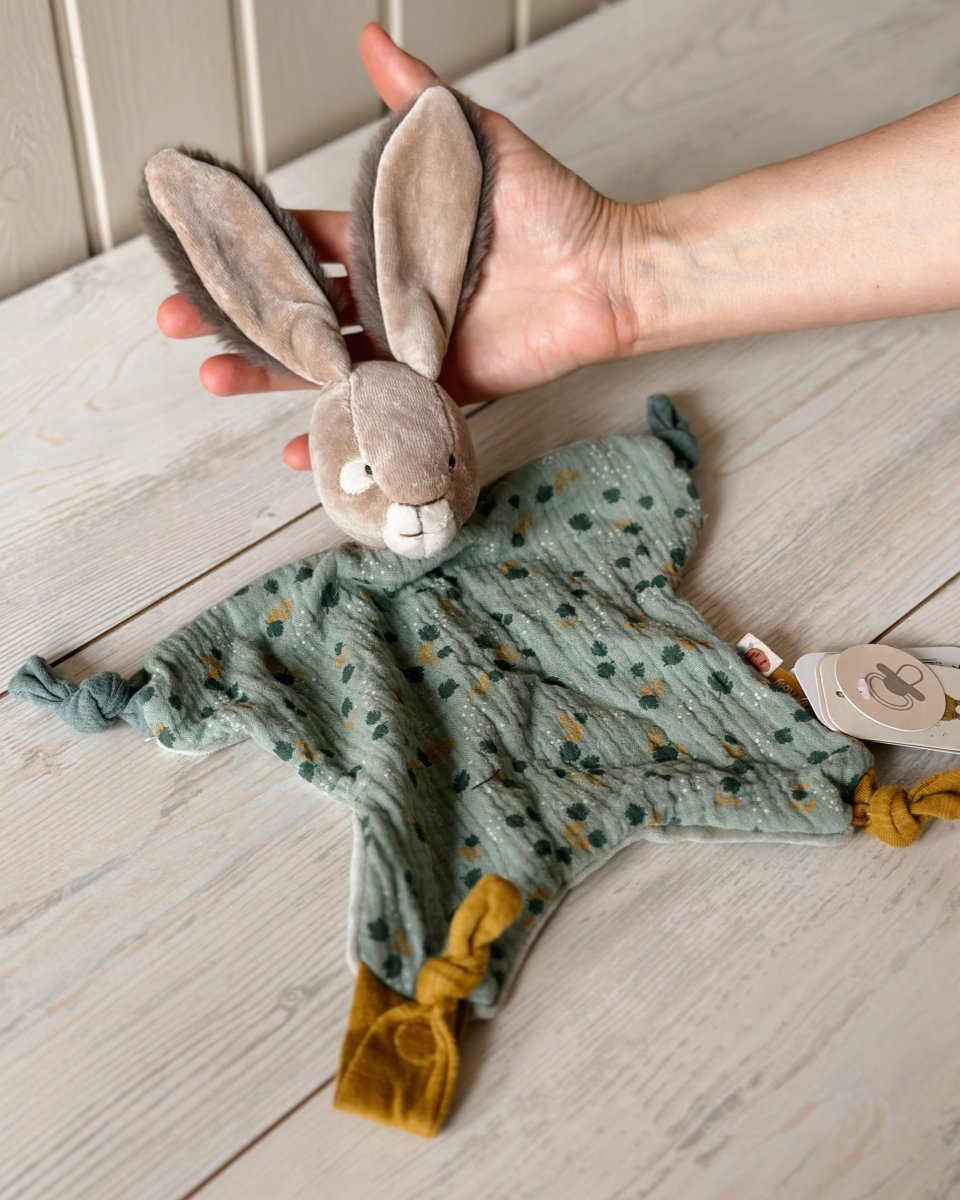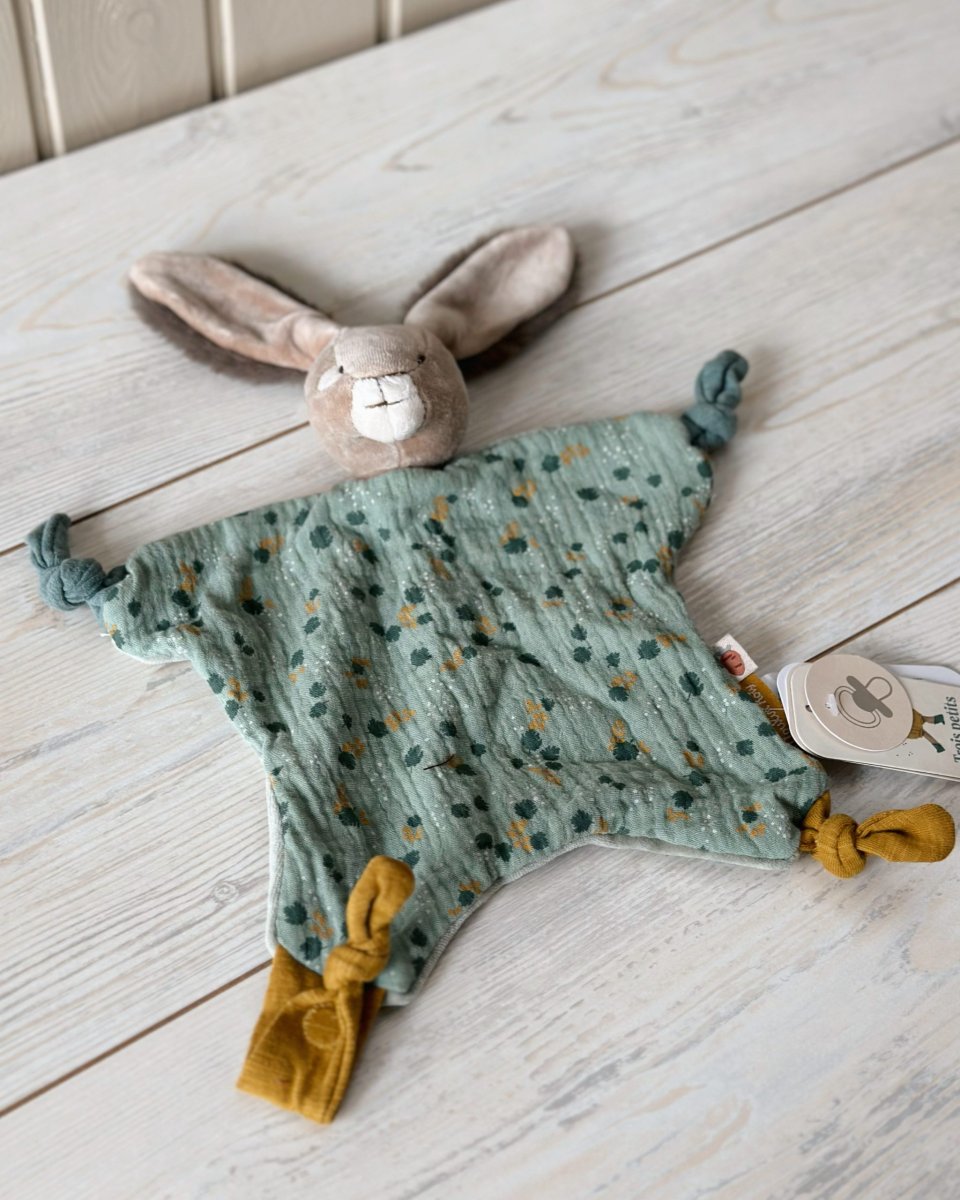Delizioso e morbidissimo Dou Dou di Moulin Roty a forma di coniglietto nelle tonalità del verde salvia. E’ dotato di un pratico bottone automatico per poter attaccare il ciuccio. Amico fedele di nanne.