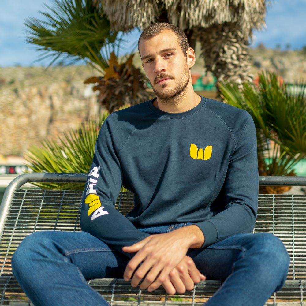 Felpa Piqué. Girocollo. Maniche raglan. Fondo manica e fondo capo a costine. Cotone Bio di alta qualitá certificato, felpa indicata per la stagione primaverile/ autunnale Stampa logo awaya sul braccio destro. e sul petto. Disponibile nel colore: Blu Navy