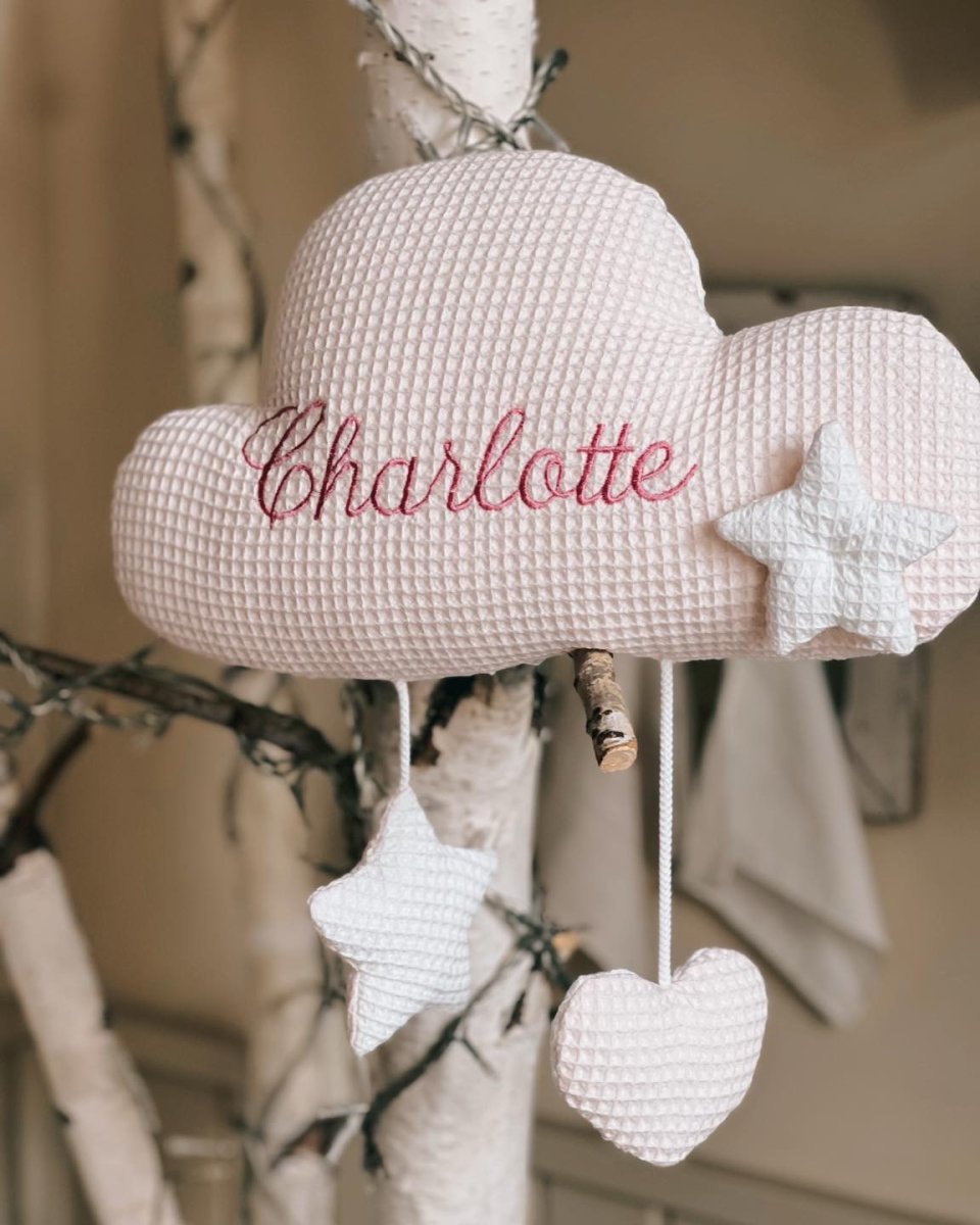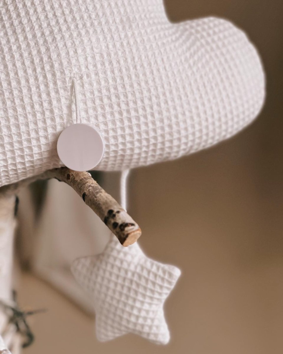 Fiocco nascita a forma di nuvoletta in nido d’ape organico con carillon e pendenti con stelline e cuoricini. Il fiocco nascita si puรฒ lavare in lavatrice a 30ยฐ, senza dover rimuovere il carillon.