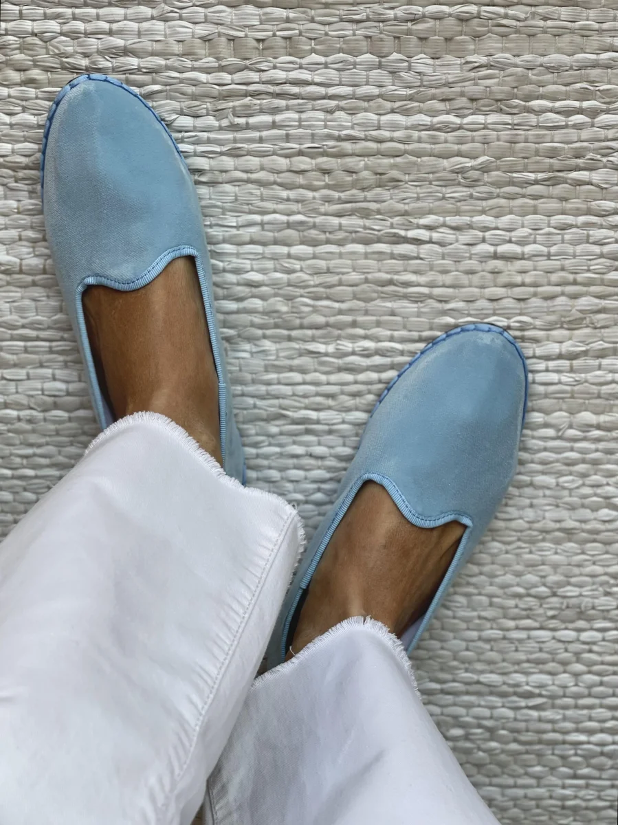 Friulane classiche con punta stondata, esterno in velluto di cotone e rivestimento interno in cotone bianco. Suola in gomma. Calzata ridotta.