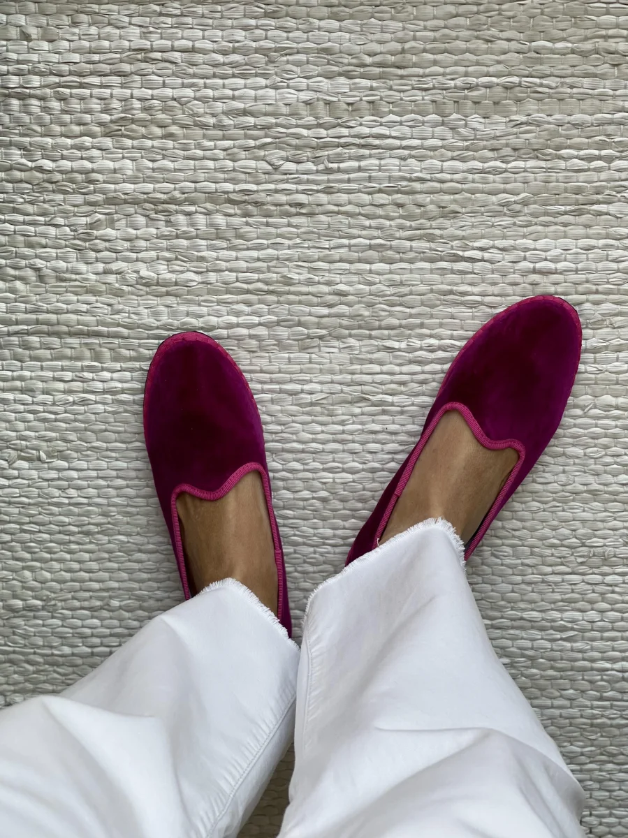 Friulane classiche con punta stondata, esterno in velluto di cotone e rivestimento interno in cotone bianco. Suola in gomma. Calzata ridotta.