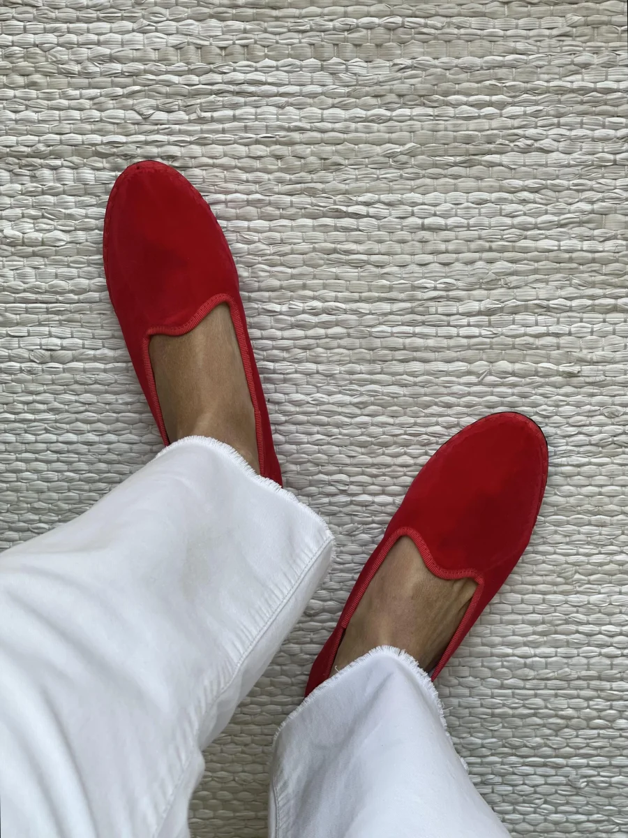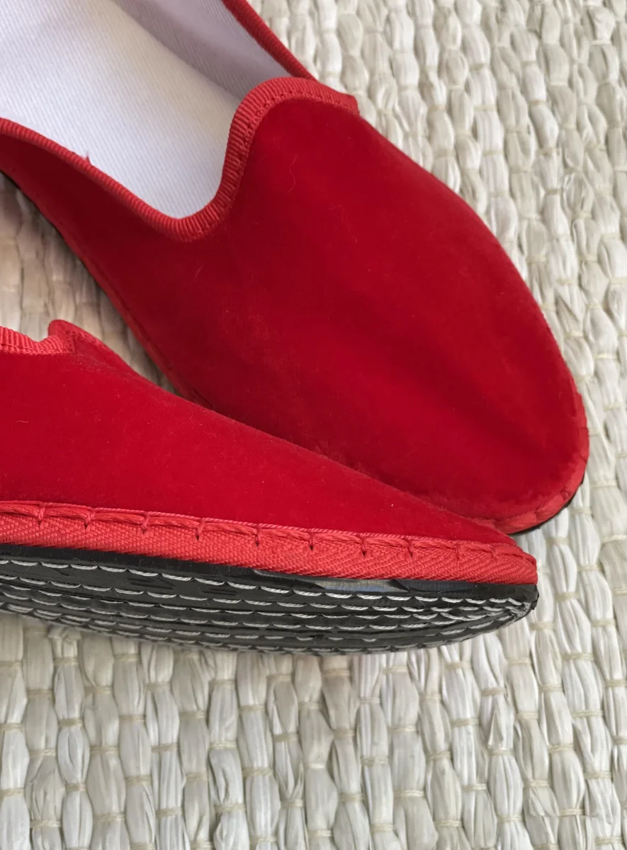Friulane classiche con punta stondata, esterno in velluto di cotone e rivestimento interno in cotone bianco. Suola in gomma. Calzata ridotta.