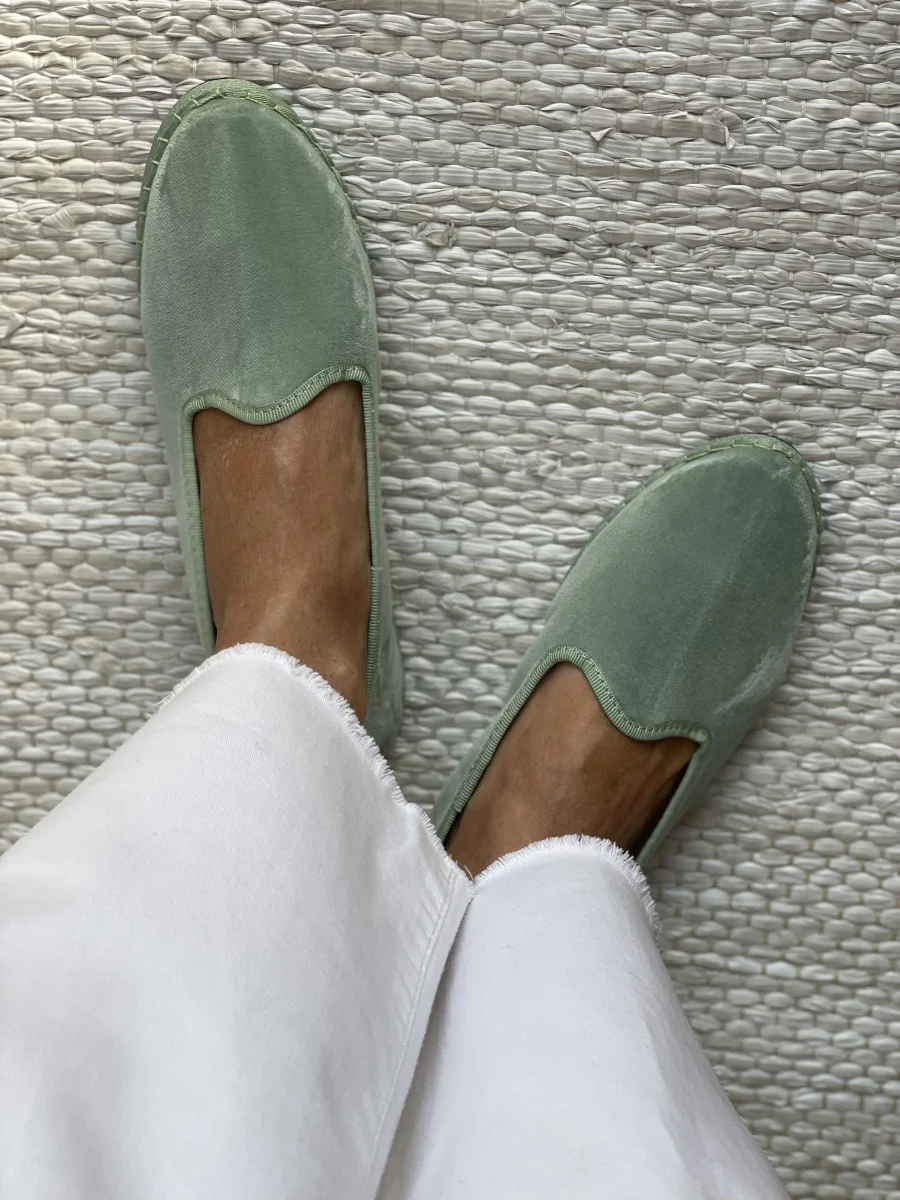 Friulane classiche con punta stondata, esterno in velluto di cotone e rivestimento interno in cotone bianco. Suola in gomma. Calzata ridotta.