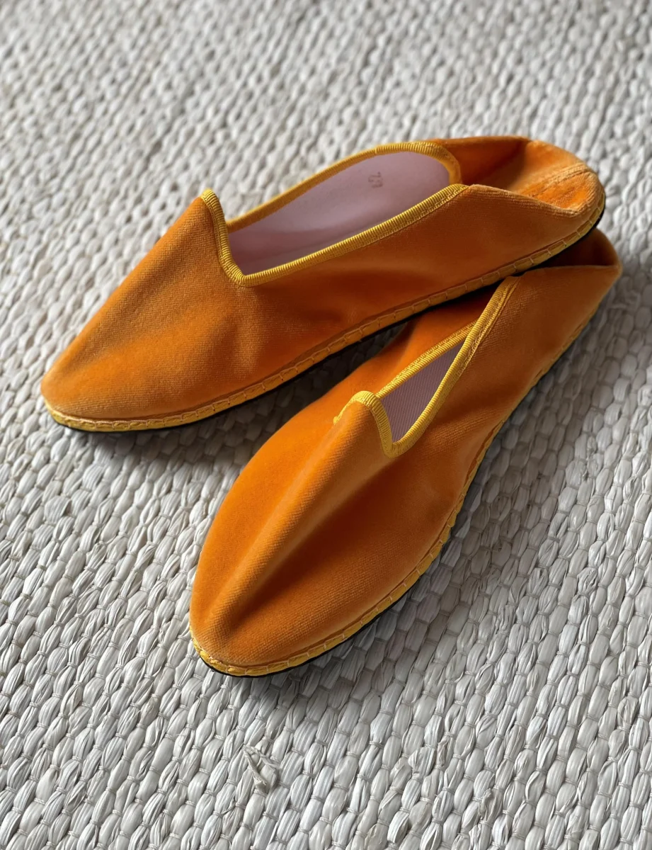 Friulane classiche con punta stondata, esterno in velluto di cotone e rivestimento interno in cotone bianco. Suola in gomma. Calzata ridotta.