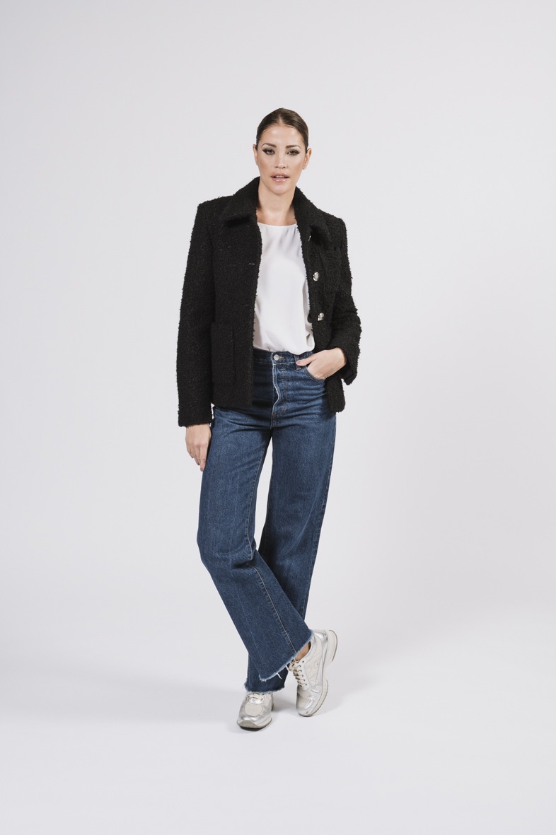Scopri la nostra raffinata giacca da donna, realizzata in pregiato tessuto bouclé nero al 100% in poliestere. Questo capo dallo stile sofisticato è impreziosito da una chiusura a quattro bottoni cromati che ne esalta l’eleganza. Le pratiche tasche a toppa, complete di un taschino coordinato, offrono funzionalità senza compromettere lo stile. Il rever a camicia conferisce un tocco di classicità, mentre lo spacco singolo sul retro aggiunge un elemento di movimento e modernità. L’interno, foderato con una trapunta imbottita, assicura calore e comfort, rendendo questa giacca perfetta per le giornate più fresche. Ideale da abbinare a un look casual o elegante, questo capo è un must-have nel tuo guardaroba, capace di esaltare ogni outfit con un tocco di classe e versatilità. Indossala per sentirti sempre alla moda e a tuo agio, sia in ufficio che per una serata fuori.