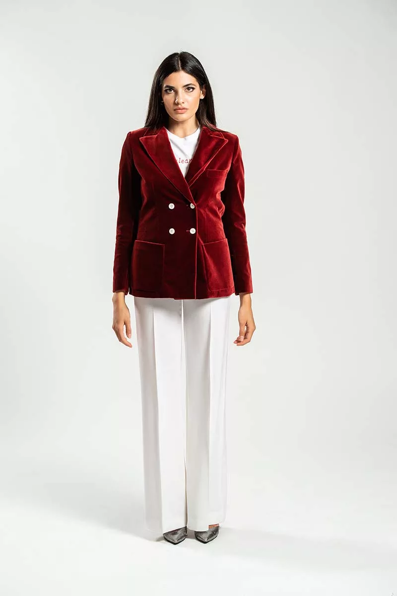 Un capo moderno e contemporaneo della linea regular Baleani realizzato in un raffinato velluto liscio. Giacca doppiopetto con tasche applicate e rever larghi, il tutto abbinato ai bottoni madreperla che completano il modello e lo rendono perfetto per i look da ufficio o per le occasioni formali.