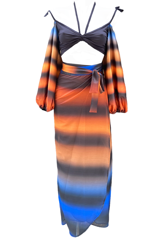 Gonna lunga pareo laminata Sunset: un must have con chiusura a portafoglio che la rende pratica ed elegante allo stesso tempo