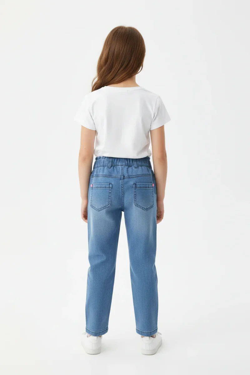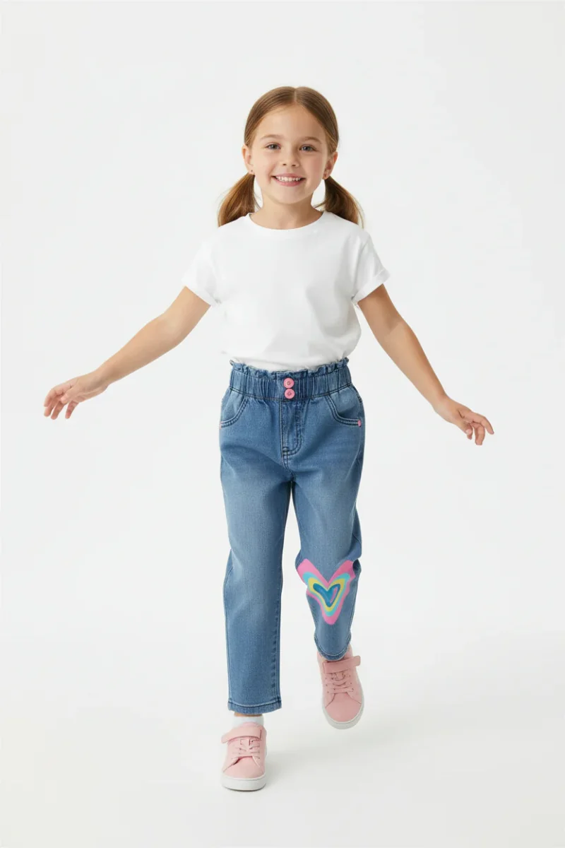 Jeans azzurri lavati per bambine con elastico in vita plissettato e doppio bottone rosa. Dotati di tasche funzionali e un affascinante motivo multicolore a forma di cuore su una gamba. Ideali per un look giovanile, confortevole e pieno di personalitร  che le bambine adoreranno indossare ogni giorno.