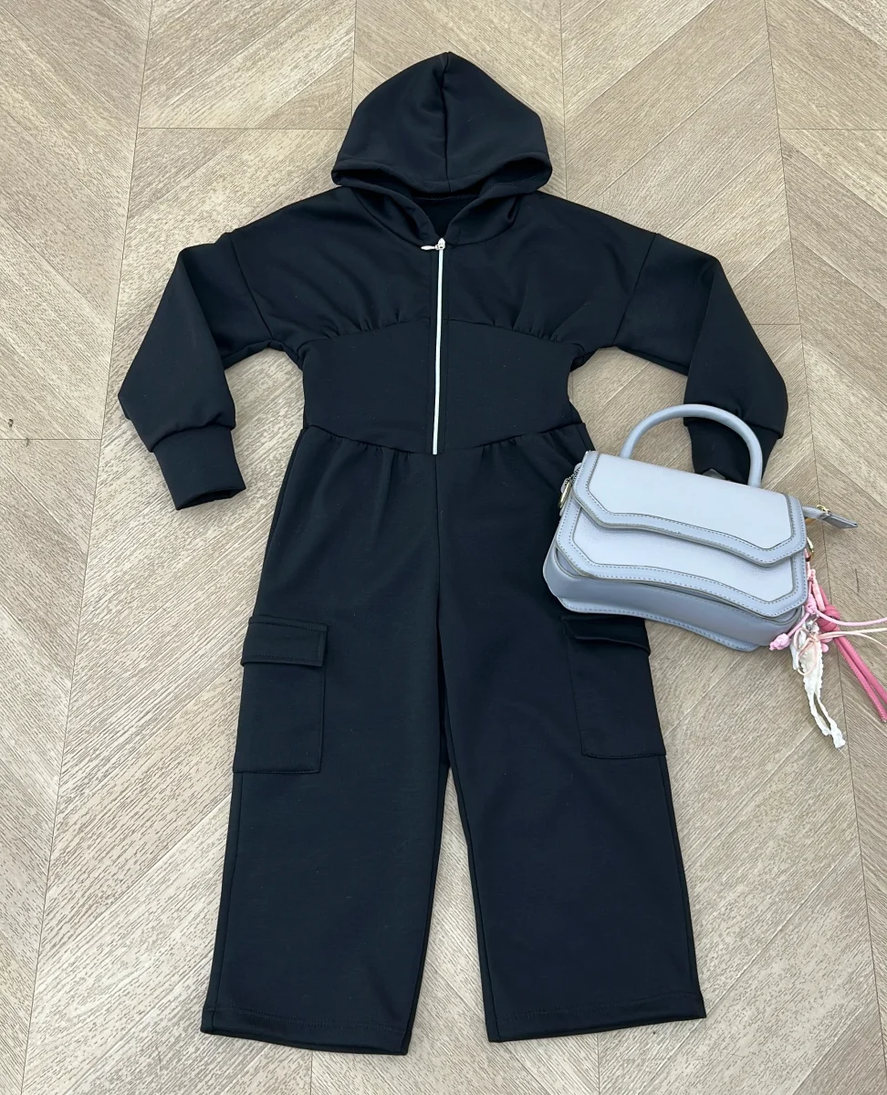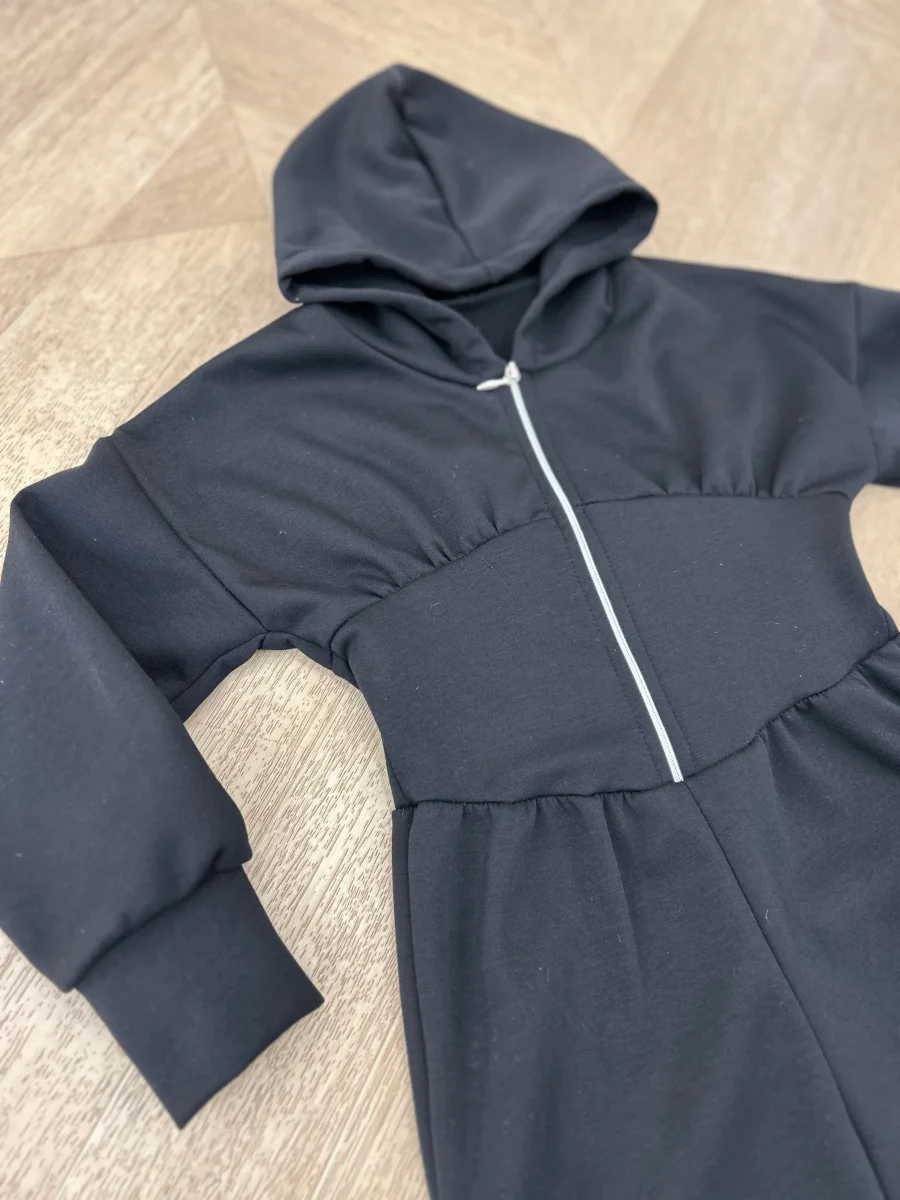 Tuta nera in cotone morbido con zip frontale e cappuccio comodo. Perfetta per le giornate casual, combina praticitร  e stile con un design moderno che piace alle bambine. La chiusura a zip facilita l’indossamento, mentre il cappuccio aggiunge un tocco di versatilitร . Ideale per giocare, scuola o tempo libero con il massimo comfort.