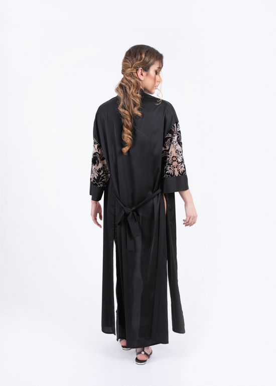 Kimono Sheikha Flock : il kimono che non puรฒ mancare nel tuo armadio! Elegante e raffinato, con dettaglio della manica flockata.