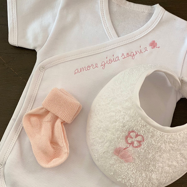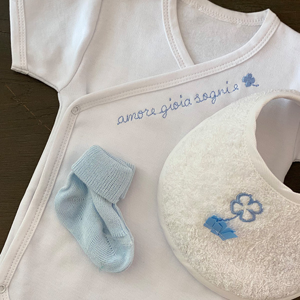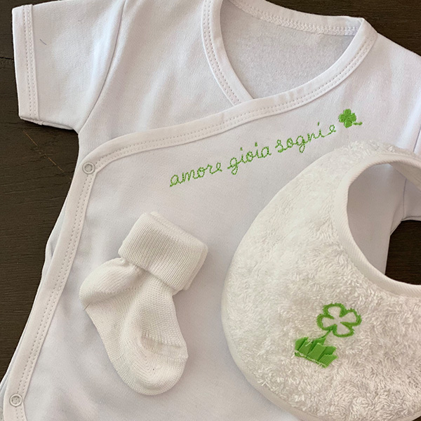 Il kit nascita รจ composto da: body della fortuna in fibra di bamboo, ecologica e antibatterica; bavagliolo nascita in spugna di cotone morbida e assorbente; calzina nascita in cotone. Tempi di produzione: 05 giorni