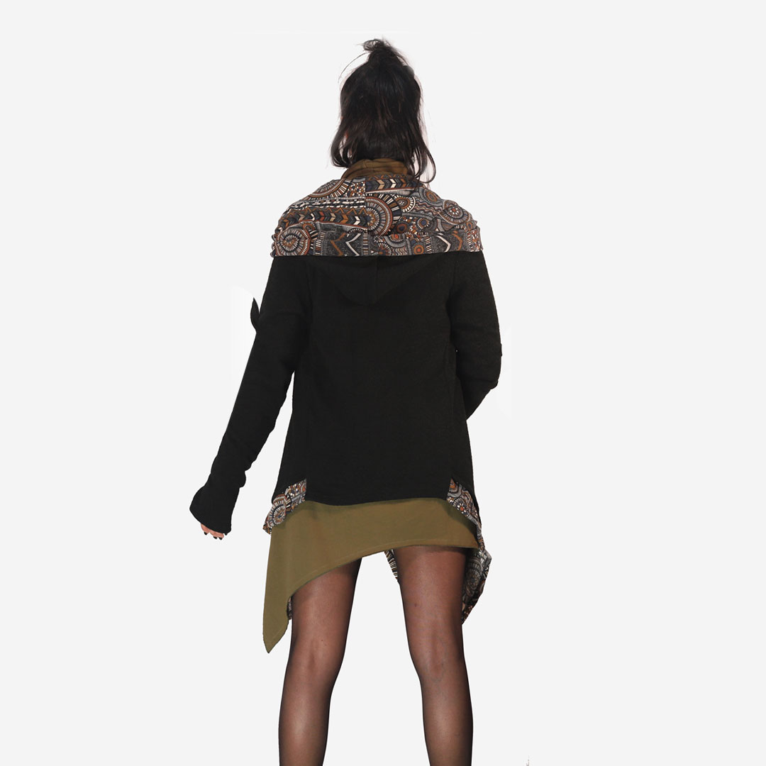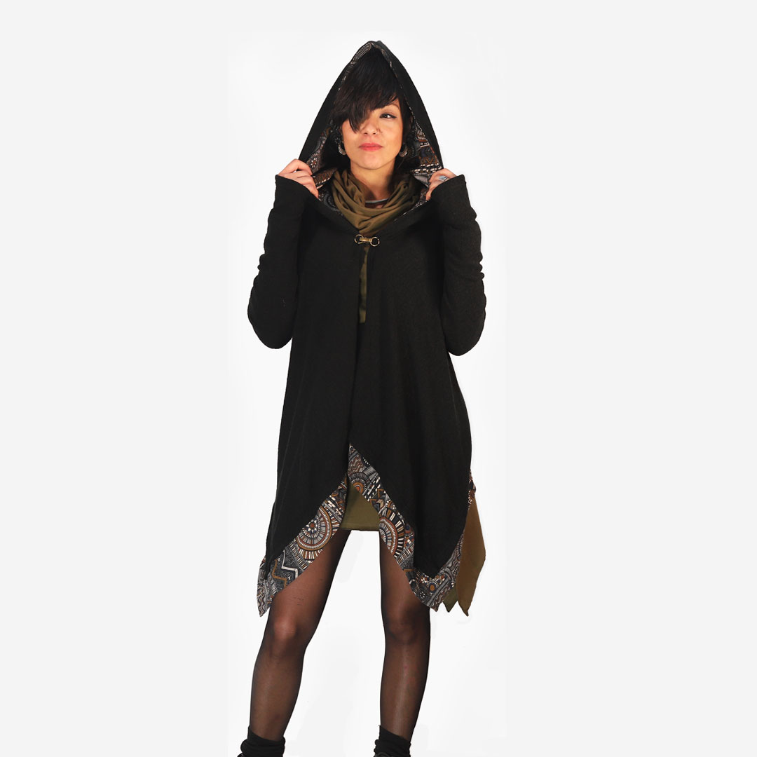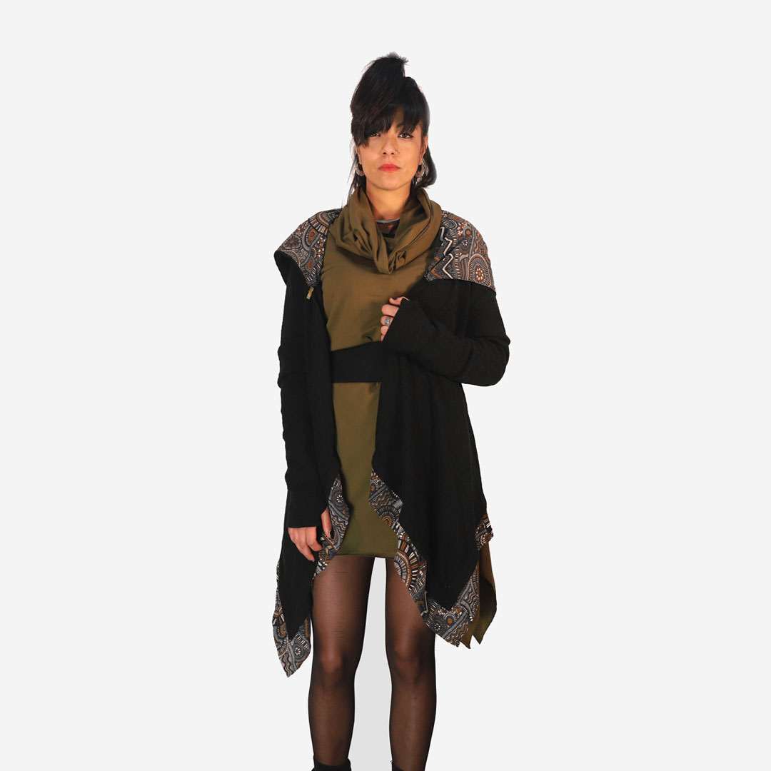 Cardigan mantella con gancio, ampio collo in tessuto doppiato che diventa un comodo cappuccio,inserto in tessuto motivo azteco,, fori per i pollici all’estremità della manica. Si chiude con un gancio centrale.